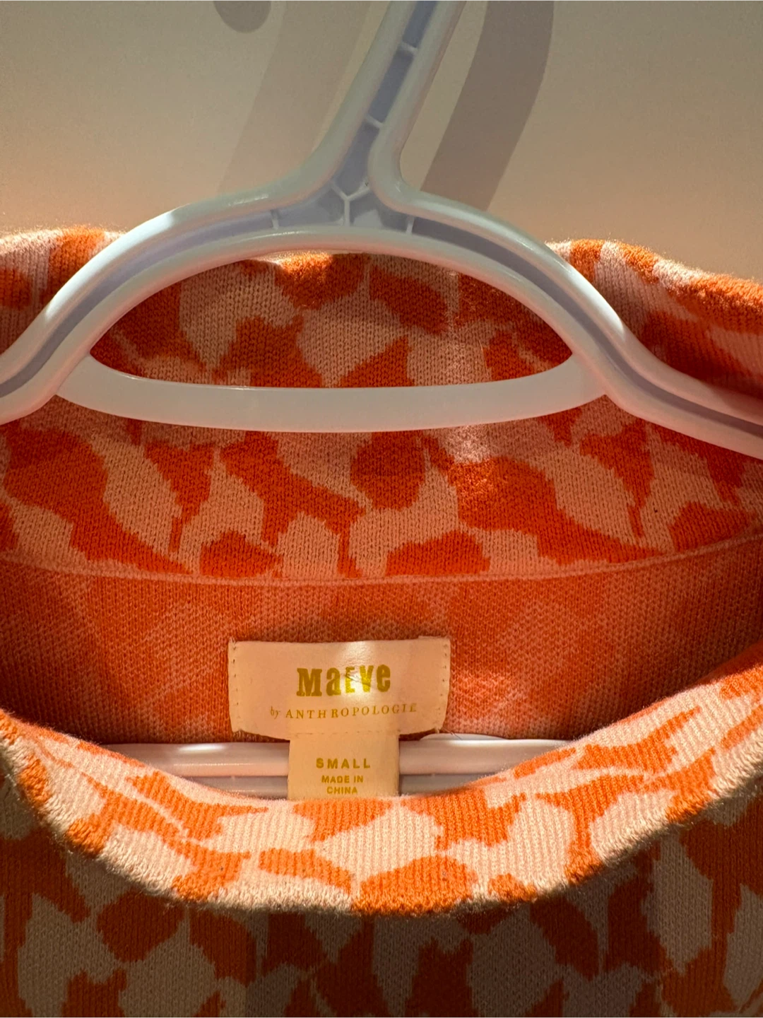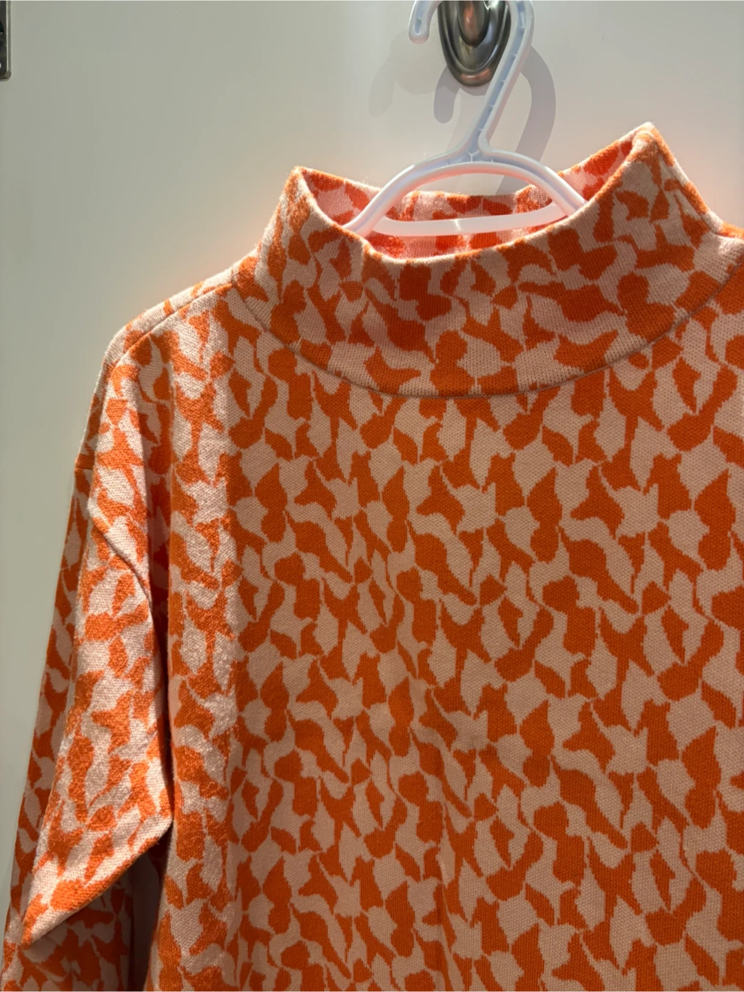 Size small and features an all-over orange and cream abstract pattern. The knit material makes it cozy for cooler days!
