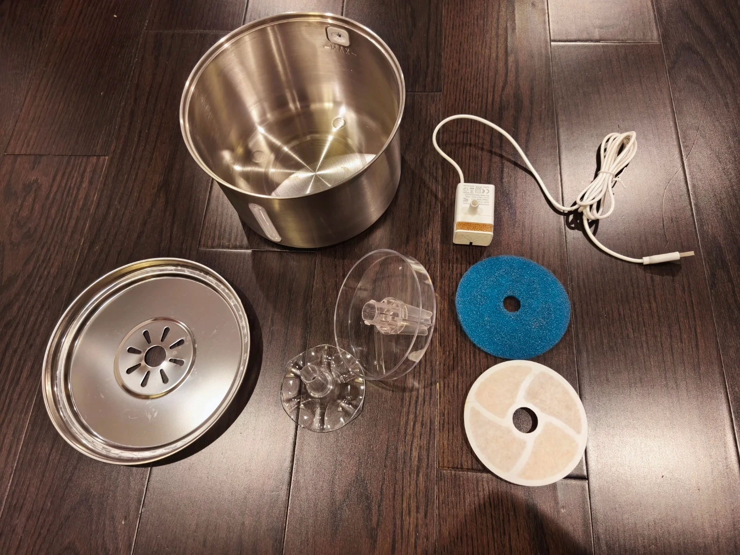 Includes the fountain base, lid, flower sprout, pump, charcoal filters, and foam filters.