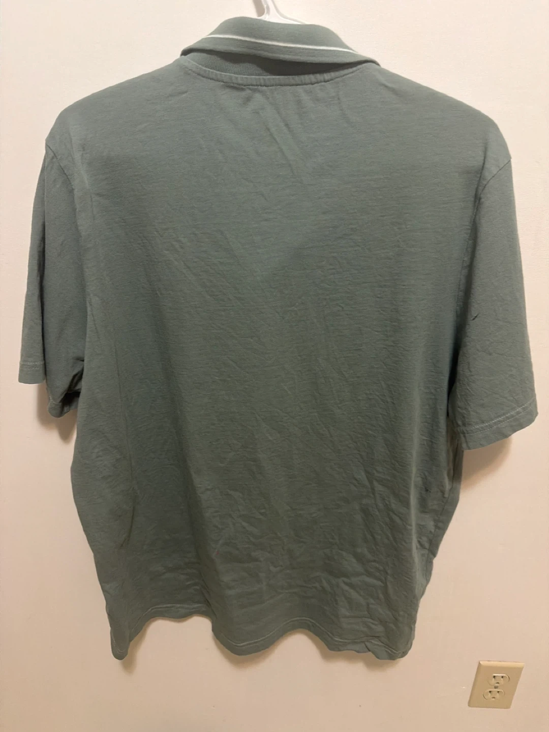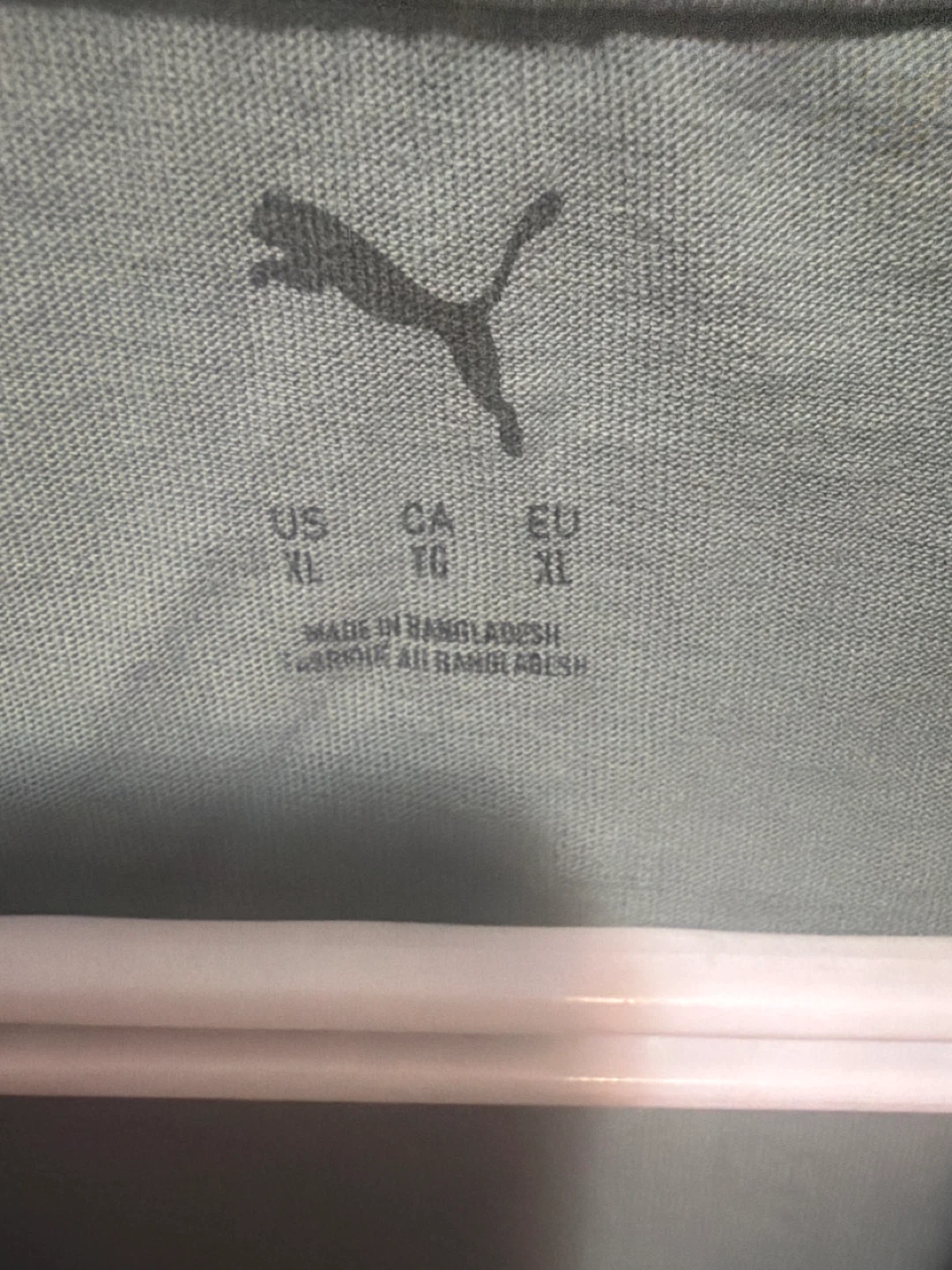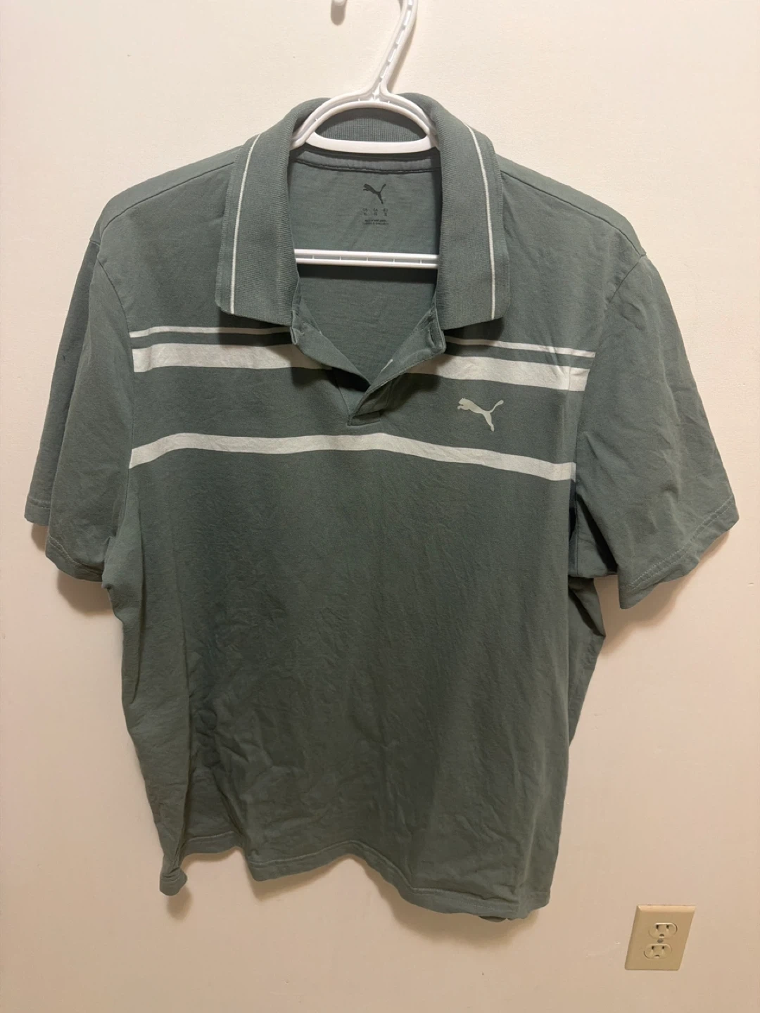 This is a men's short-sleeve polo shirt from Puma. It's a size XL and made of 100% cotton with 4% elastane in the collar. The shirt features horizontal stripes on the chest.