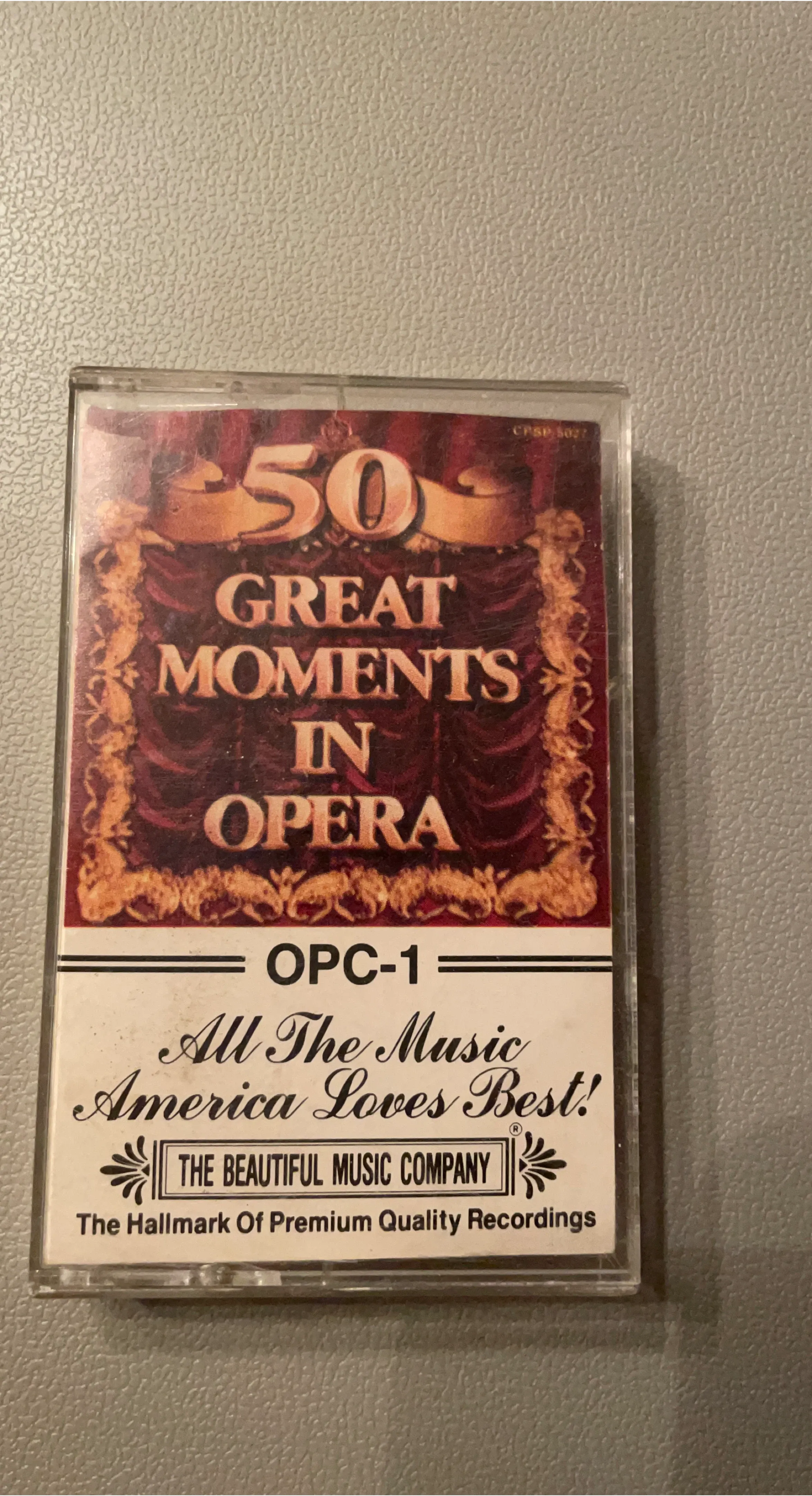 This is a cassette tape featuring '50 Great Moments In Opera'. It's from The Beautiful Music Company and has the catalog number OPC-1. The tape is titled 'All The Music America Loves Best!' and promises premium quality recordings.