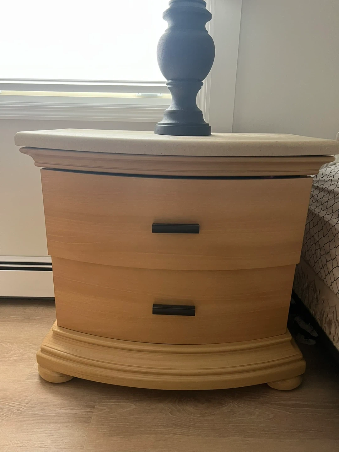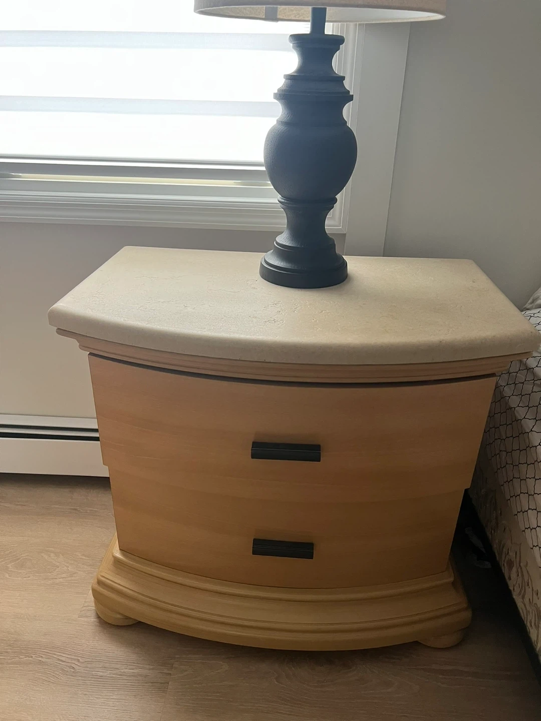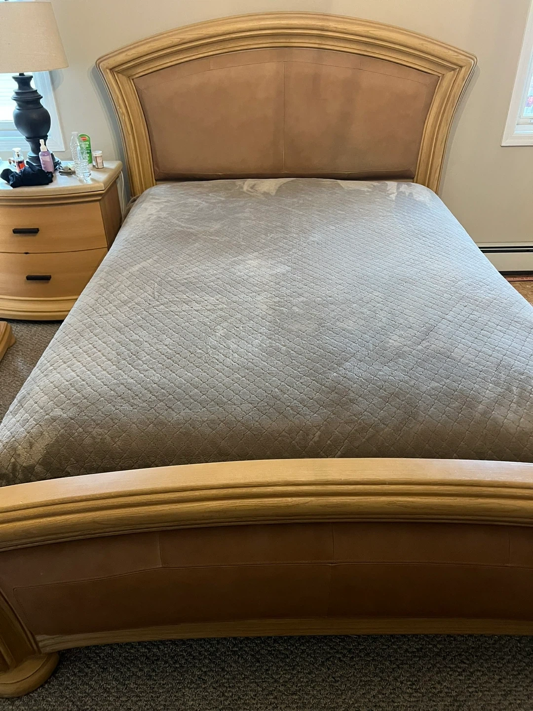 Leather headboard and footboard stone tops on both nightstands and dresser all drawers are deep and in working order.