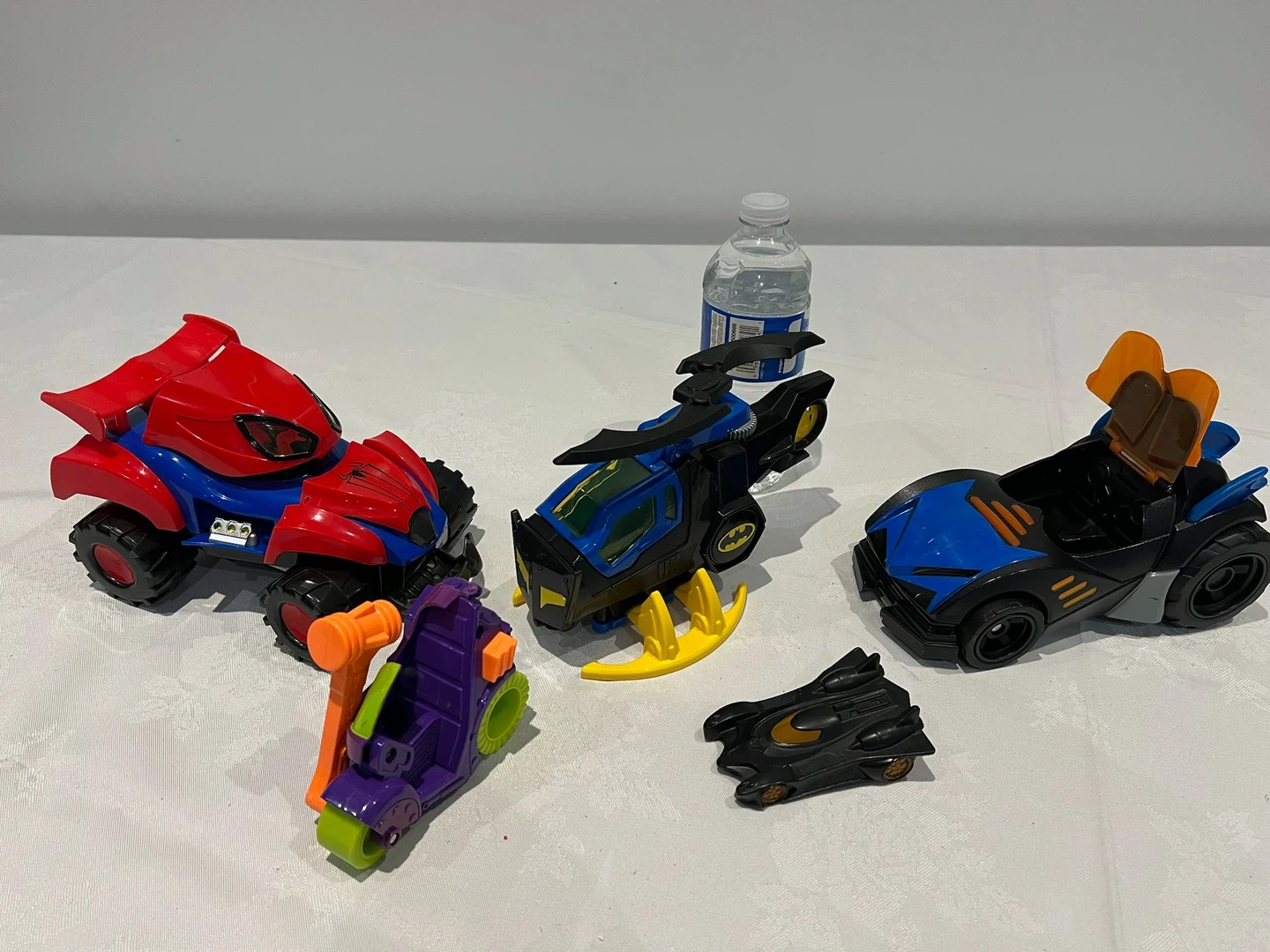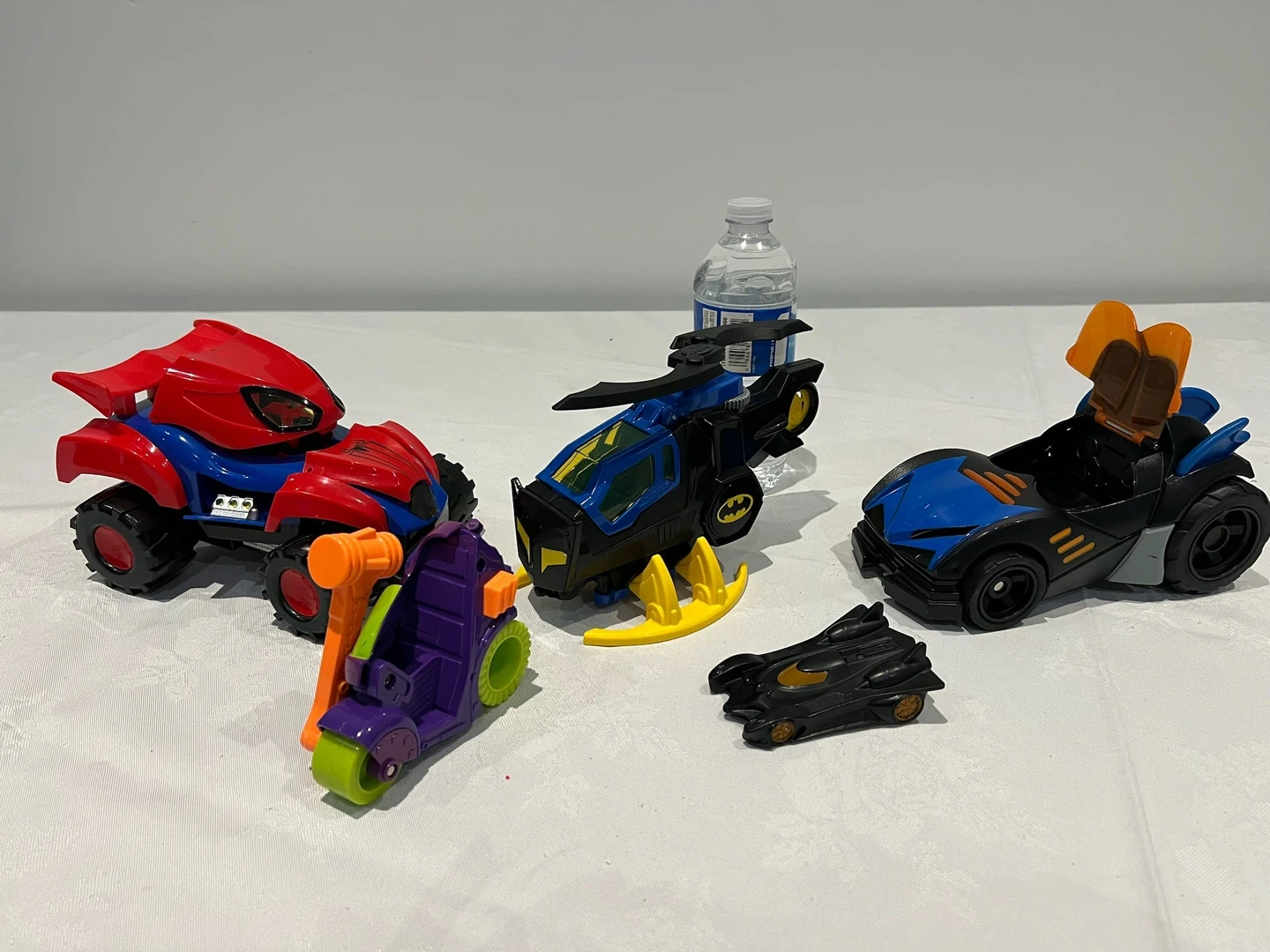 This set includes four DC Comics themed toy vehicles. One Batmobile, one Bat-Copter, a red and blue ATV, and a purple and orange motorcycle. Great for imaginative play!