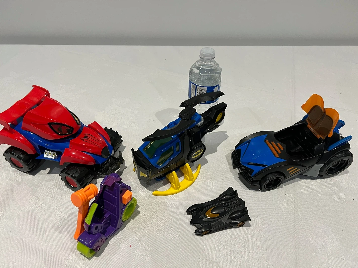 This set includes four DC Comics themed toy vehicles. One Batmobile, one Bat-Copter, a red and blue ATV, and a purple and orange motorcycle. Great for imaginative play!