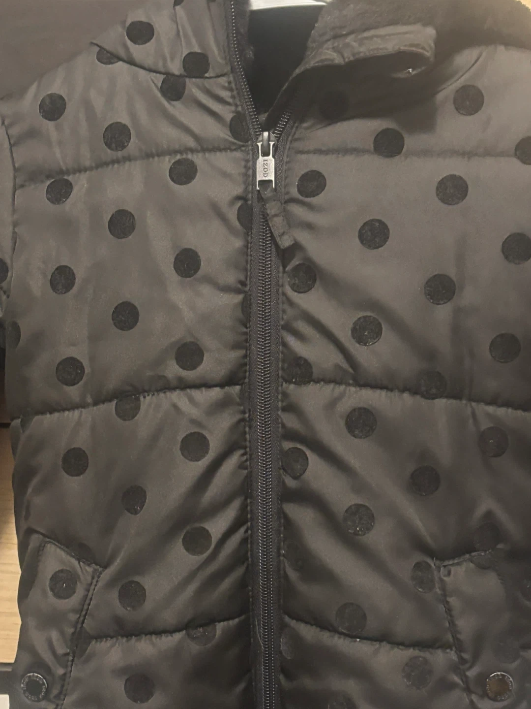 Selling a gently used IZOD puffer coat for kids! It's a size 5 and features a cute black polka dot pattern. Perfect for keeping your little one warm and stylish during the colder months.