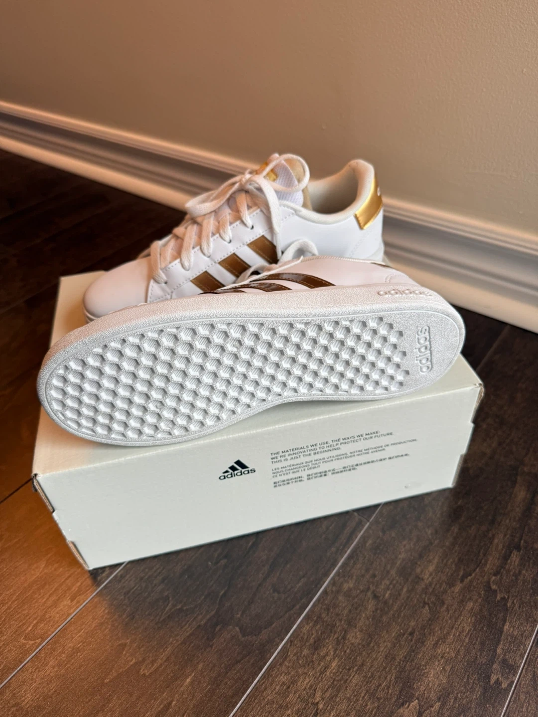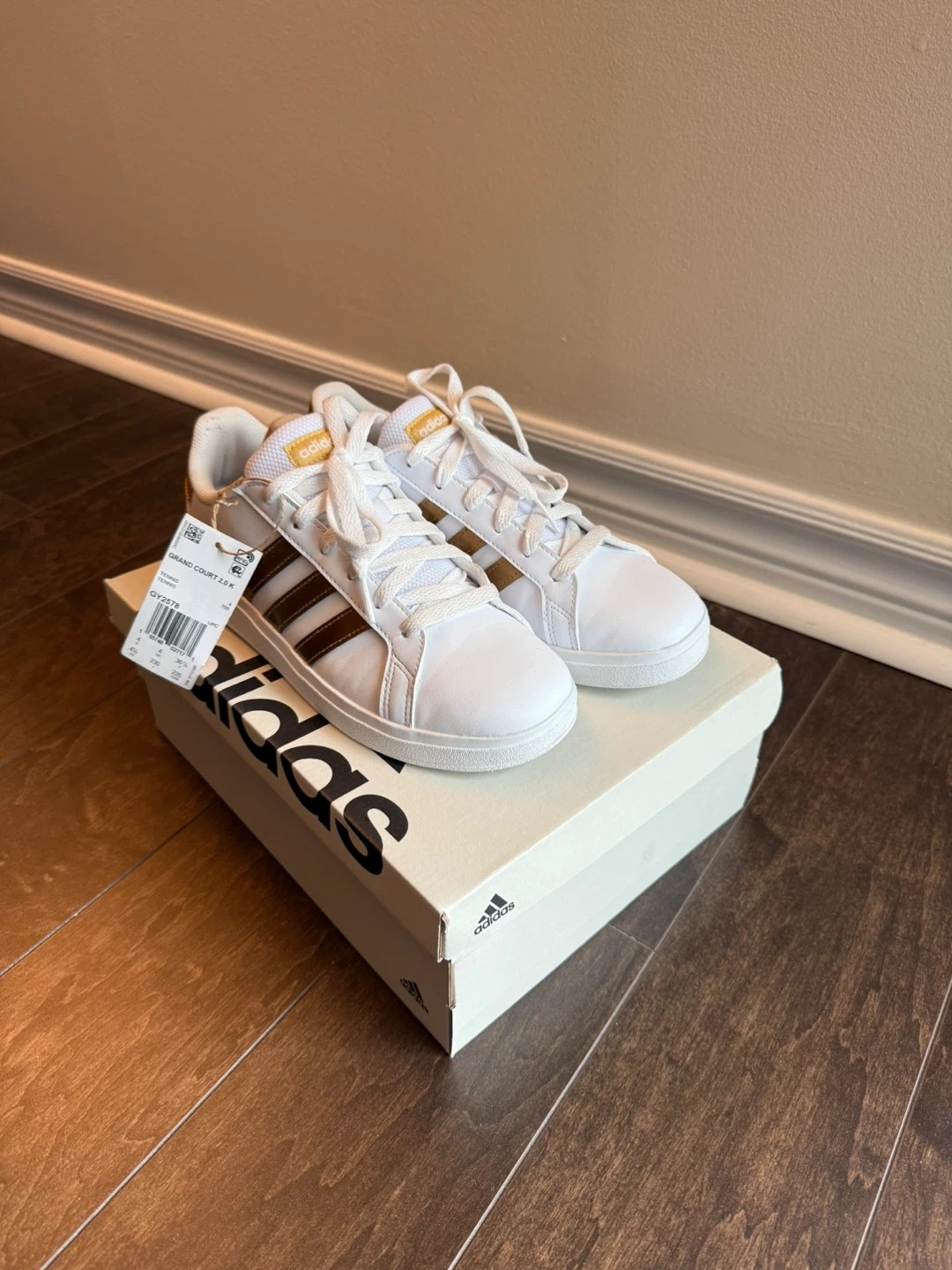 These Adidas Grand Court 2.0 K sneakers are in great condition and come with the original box! They're white with gold stripes, a classic and stylish look. The size is 4.5 in US/Canada sizing. if you fluctuate between a women's size 6, and a women's size 6.5, big kids' size 4.5 will likely be a perfect fit.