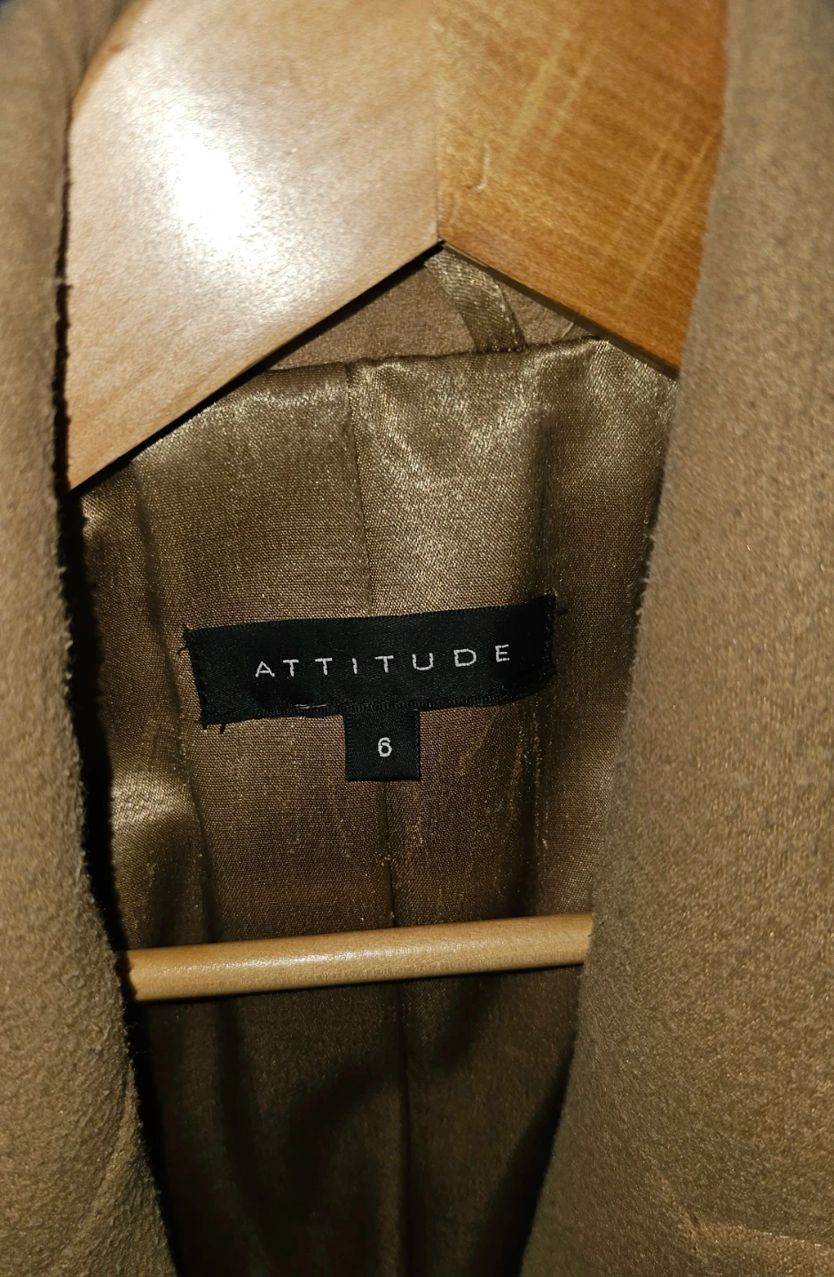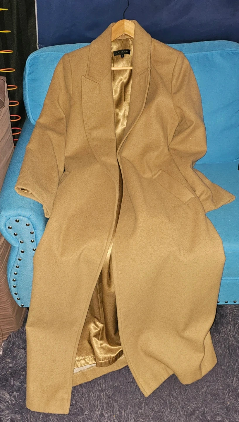 A stylish Attitude coat in a beautiful brown colour! It's a size 6 and made from a wool blend. Perfect for staying warm and looking chic during the colder months. It comes with a belt to cinch the waist for a flattering silhouette