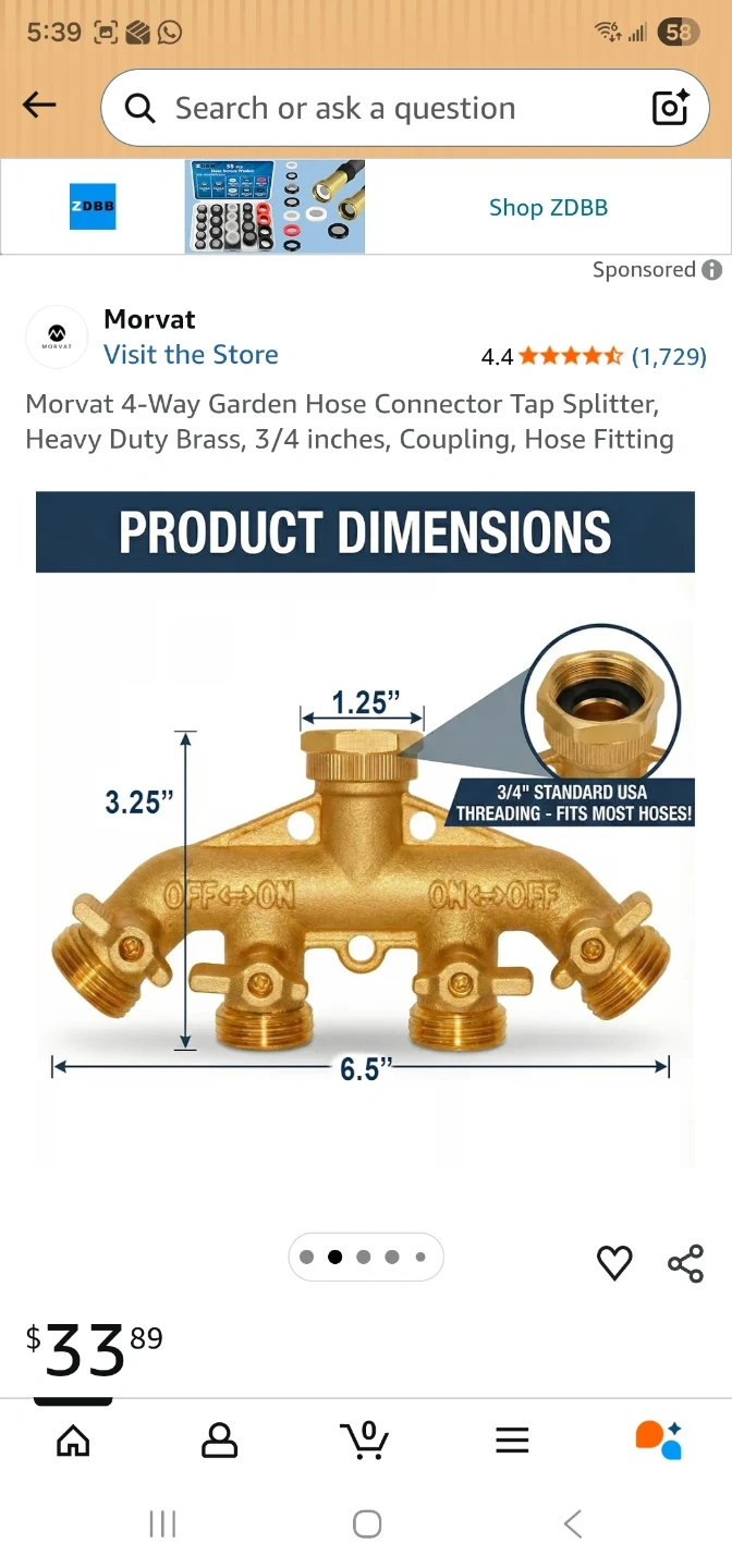 This Morvat 4-way garden hose splitter is made of heavy-duty brass for durability. It features four outlets, each with an independent ON/OFF valve. Includes extra washers and Teflon tape for a secure connection.