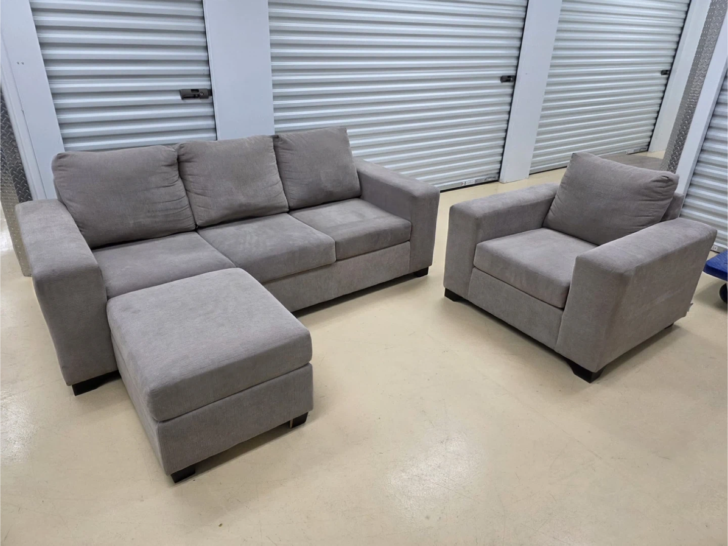 Selling a lovely grey sofa set, including a sofa, loveseat, and ottoman. It's in great condition and would be perfect for a living room or den. The neutral colour will match any decor!good condition home delivery available