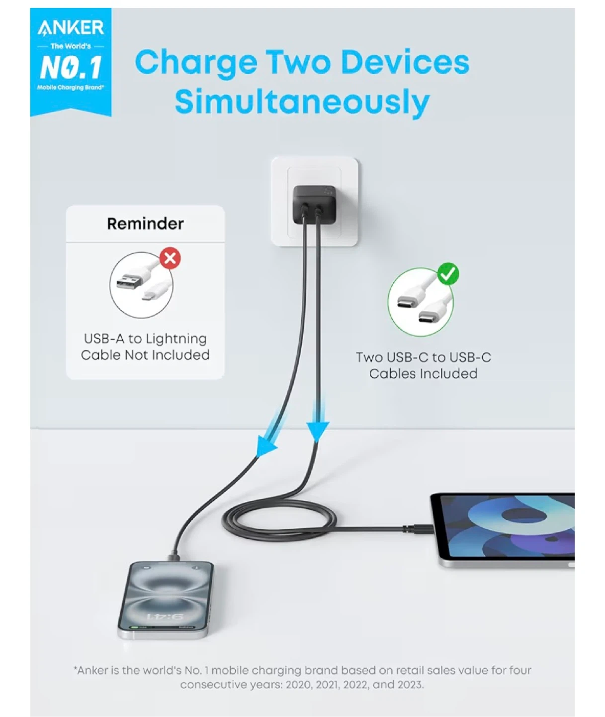 * What You Get: Anker Charger (2-Port, 20W), and 5 ft USB C to USBC