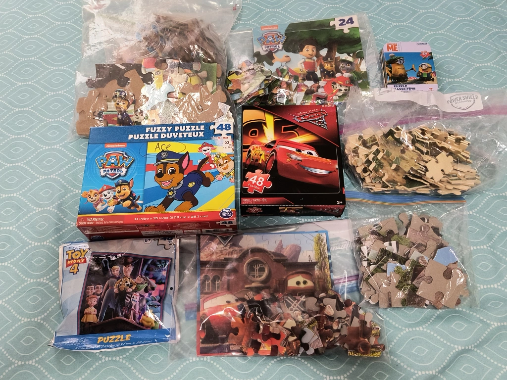 Calling puzzle lover kids. A lot of various puzzles for sale. Cars, Lightning McQueen, Paw Patrol, Toy Story, Dinosaurs, Minion. Take all for $5.00.