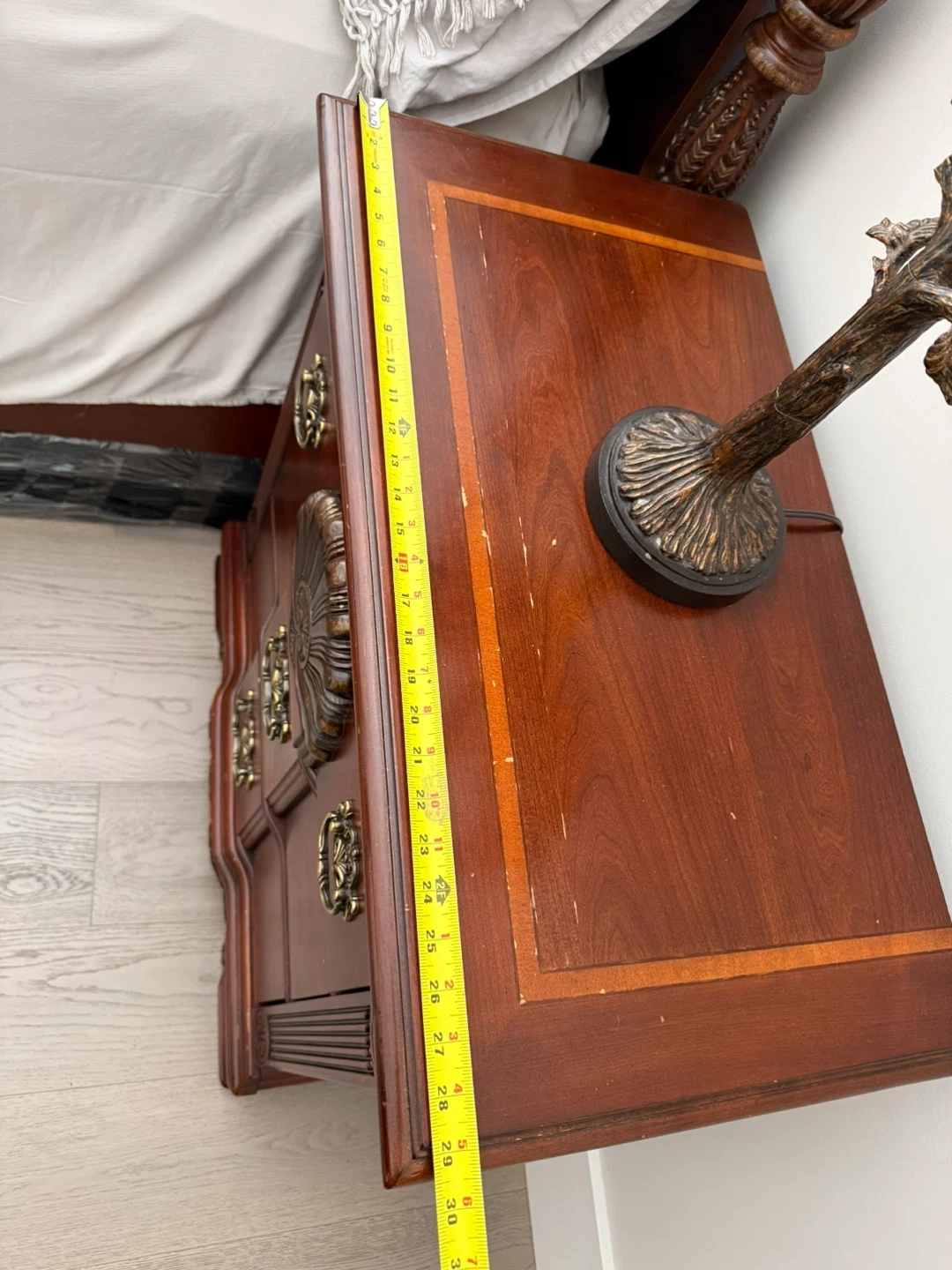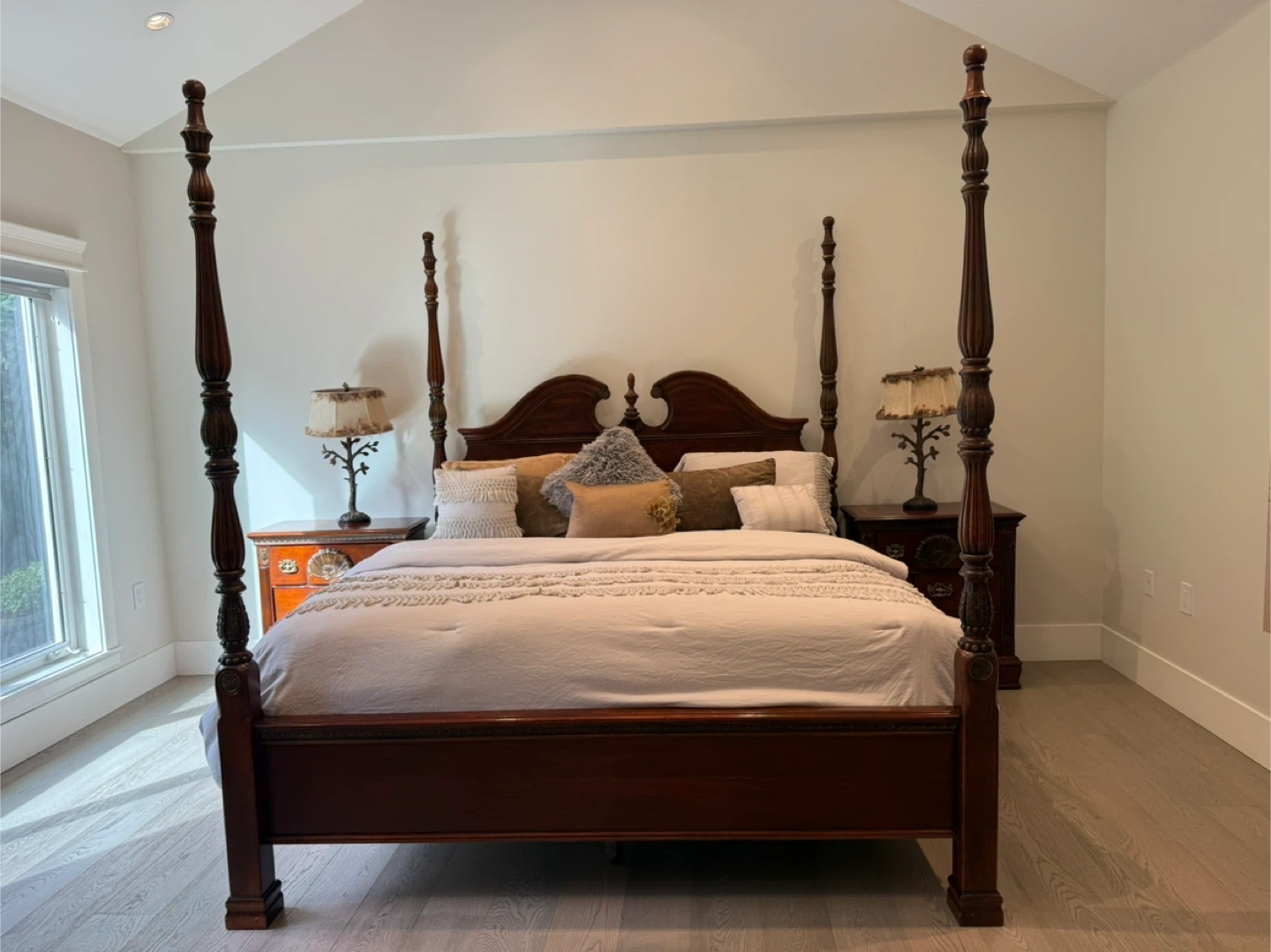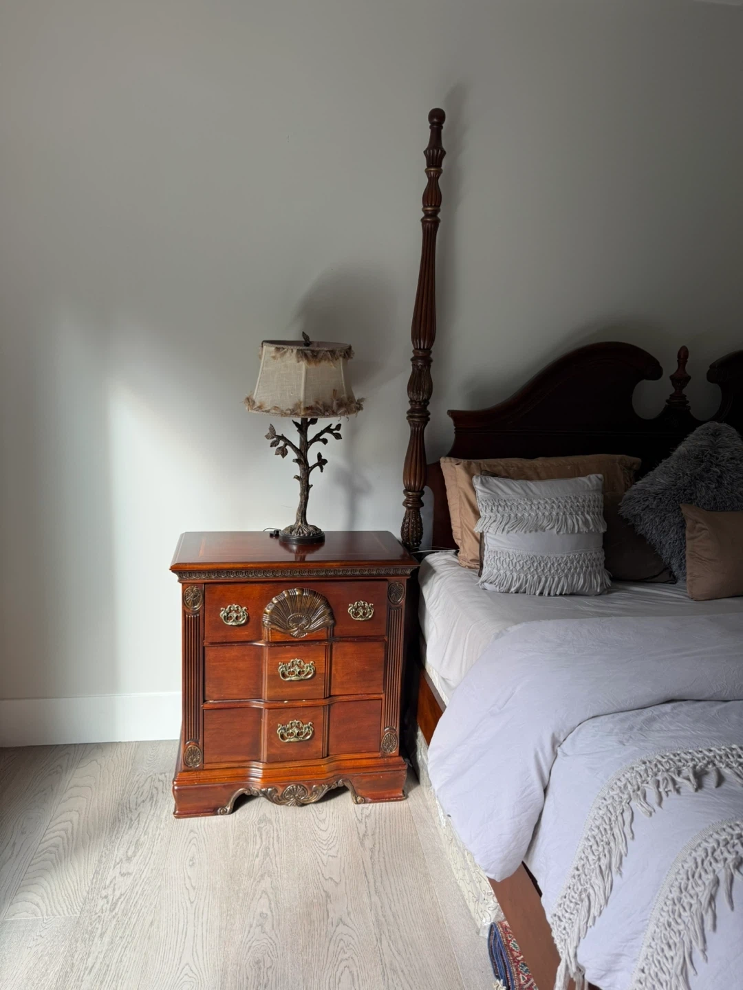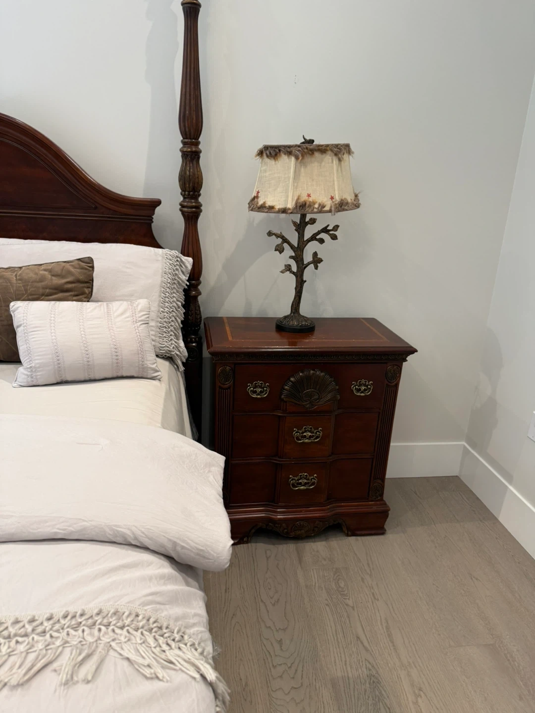 Dark wood four-poster bed frame with a headboard and footboard. Features ornate carved details and brass hardware on matching nightstands and a chest of drawers. Classic furniture style.