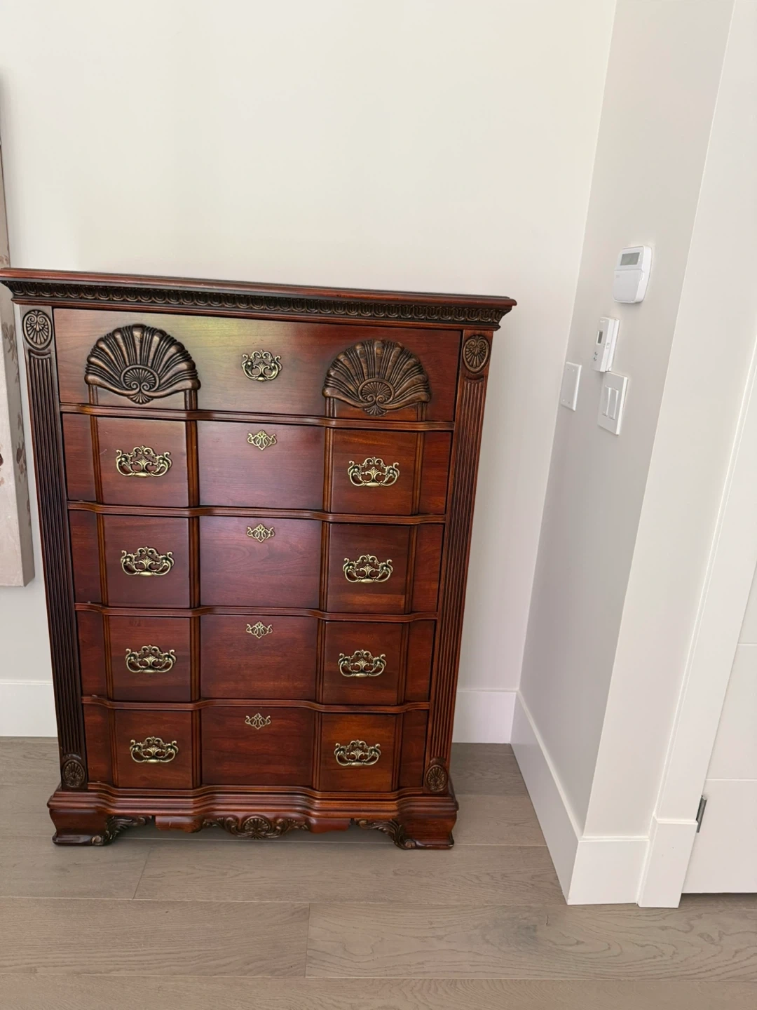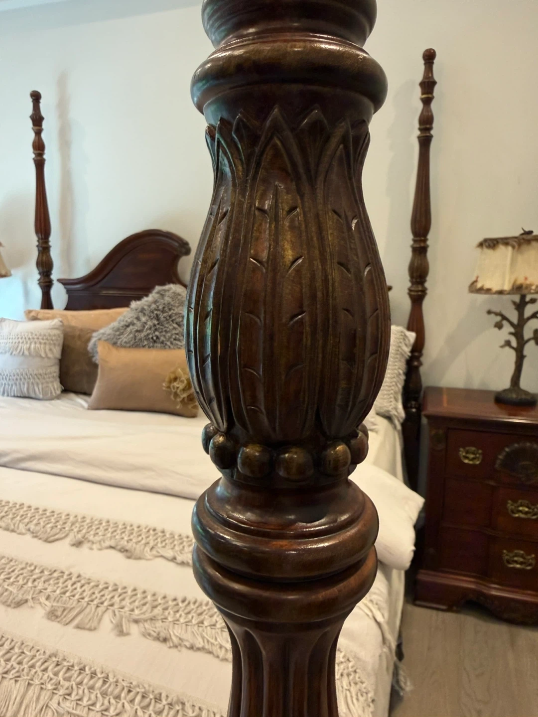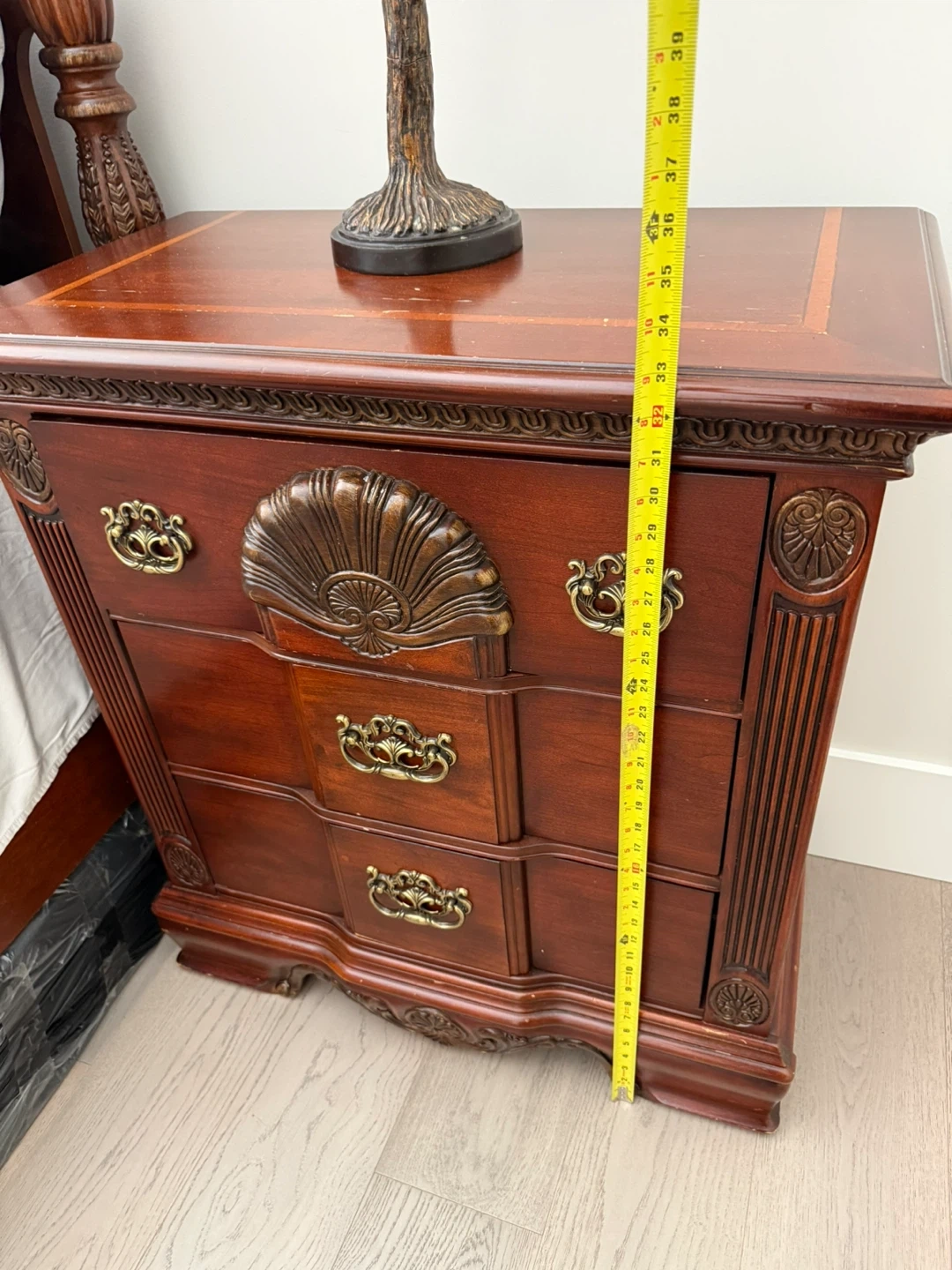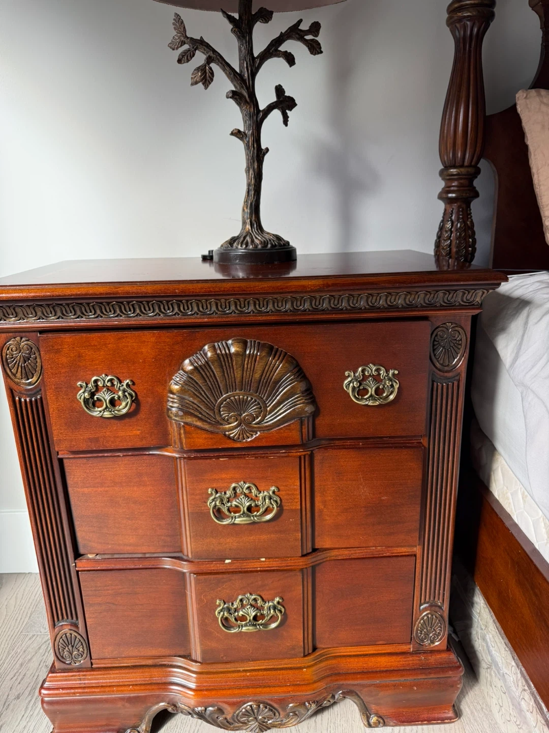 Dark wood four-poster bed frame with a headboard and footboard. Features ornate carved details and brass hardware on matching nightstands and a chest of drawers. Classic furniture style.