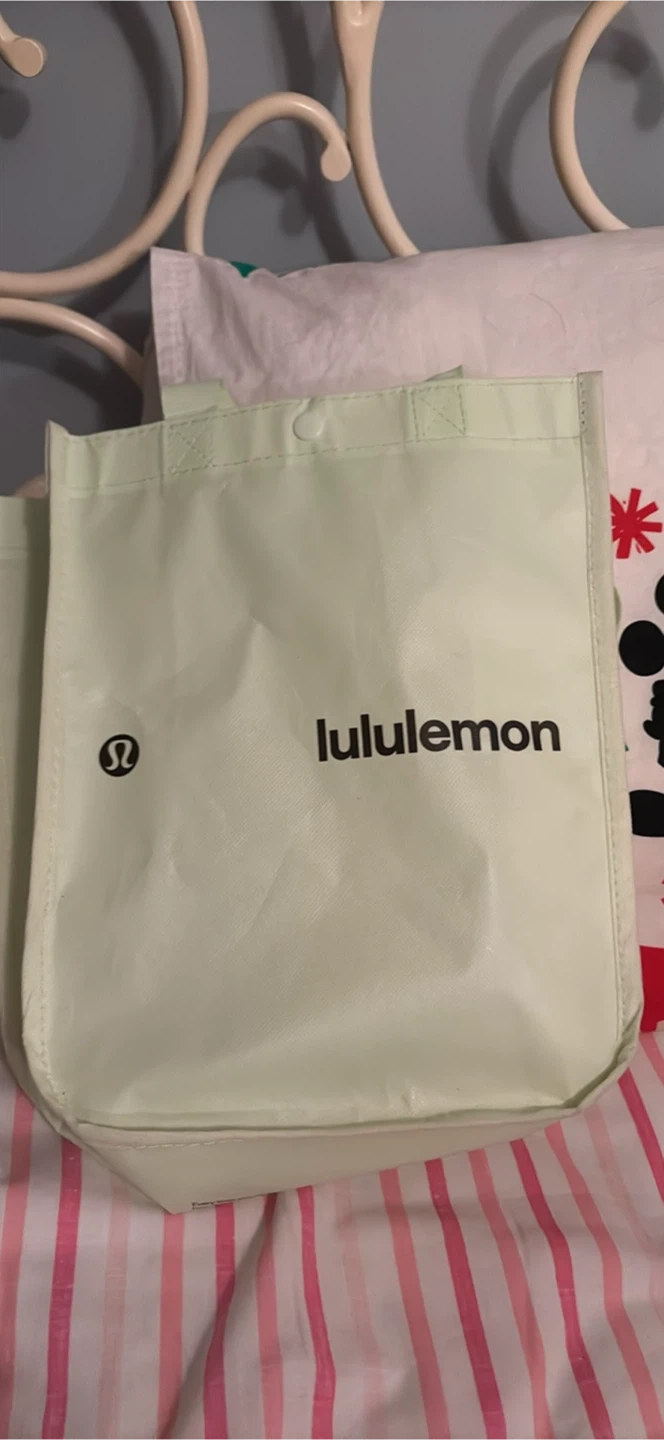 Pale green Lululemon reusable shopping tote. Comes with a snap closure at the top. It's made of a durable, wipeable material. This bag is perfect for everyday errands or gym sessions!