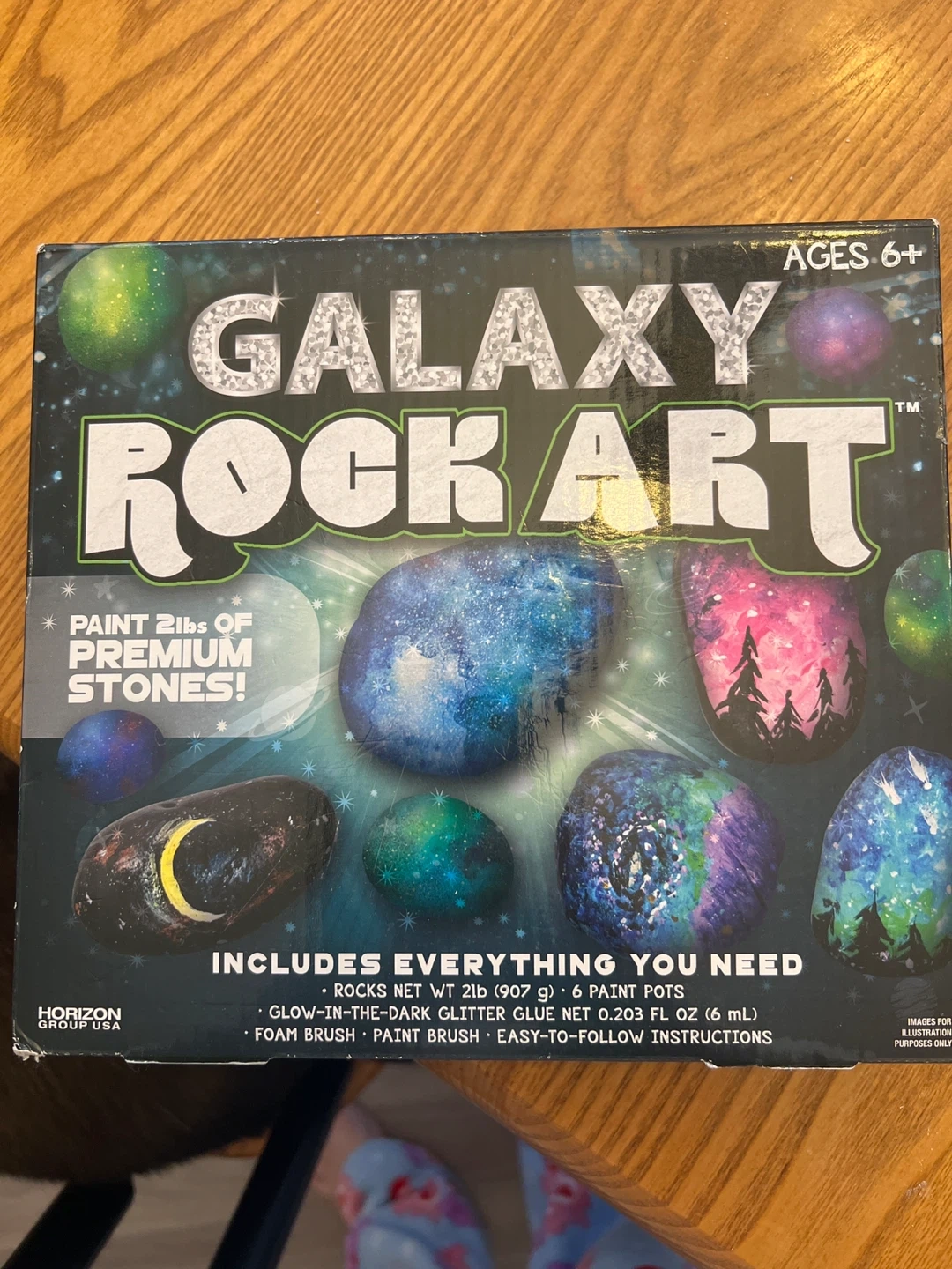 This Galaxy Rock Art kit includes everything you need to paint premium stones. It comes with 2 lbs of rocks, 6 paint pots, glow-in-the-dark glitter glue, a foam brush, and a paint brush. Easy-to-follow instructions are also included. Not used