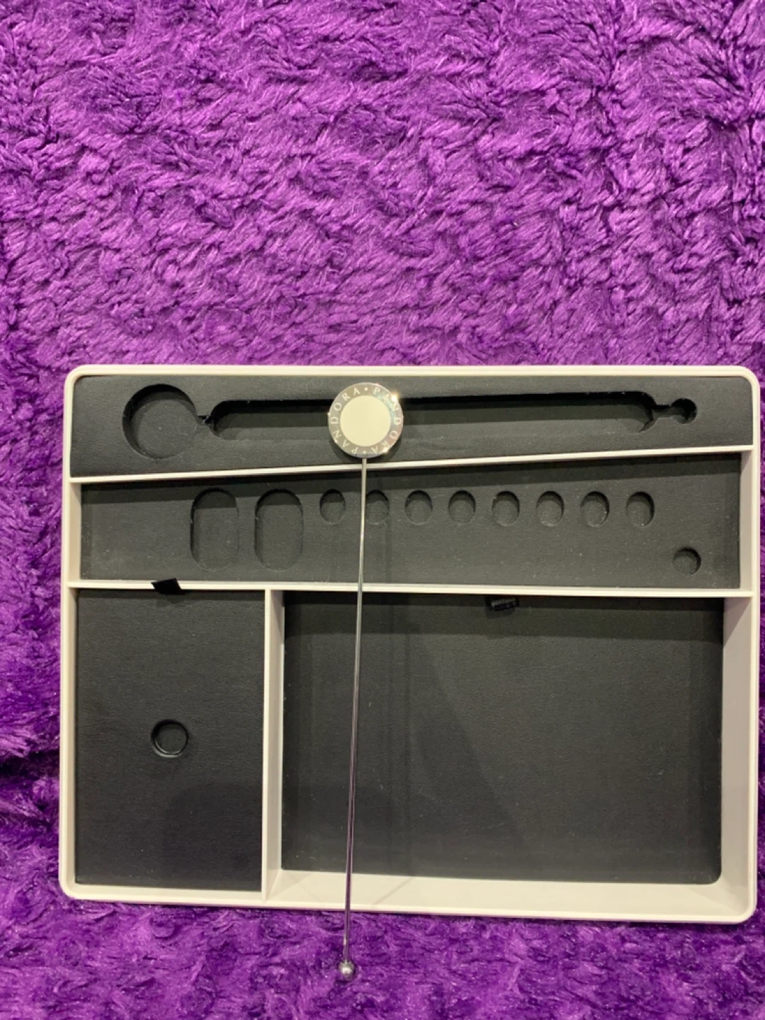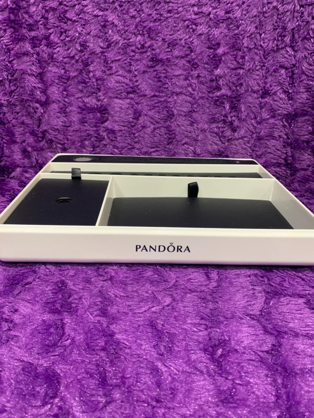 This is a Pandora jewellery display tray. It's designed with multiple compartments to hold rings, bracelets, and other small accessories. It's perfect for keeping your Pandora collection neatly organized.