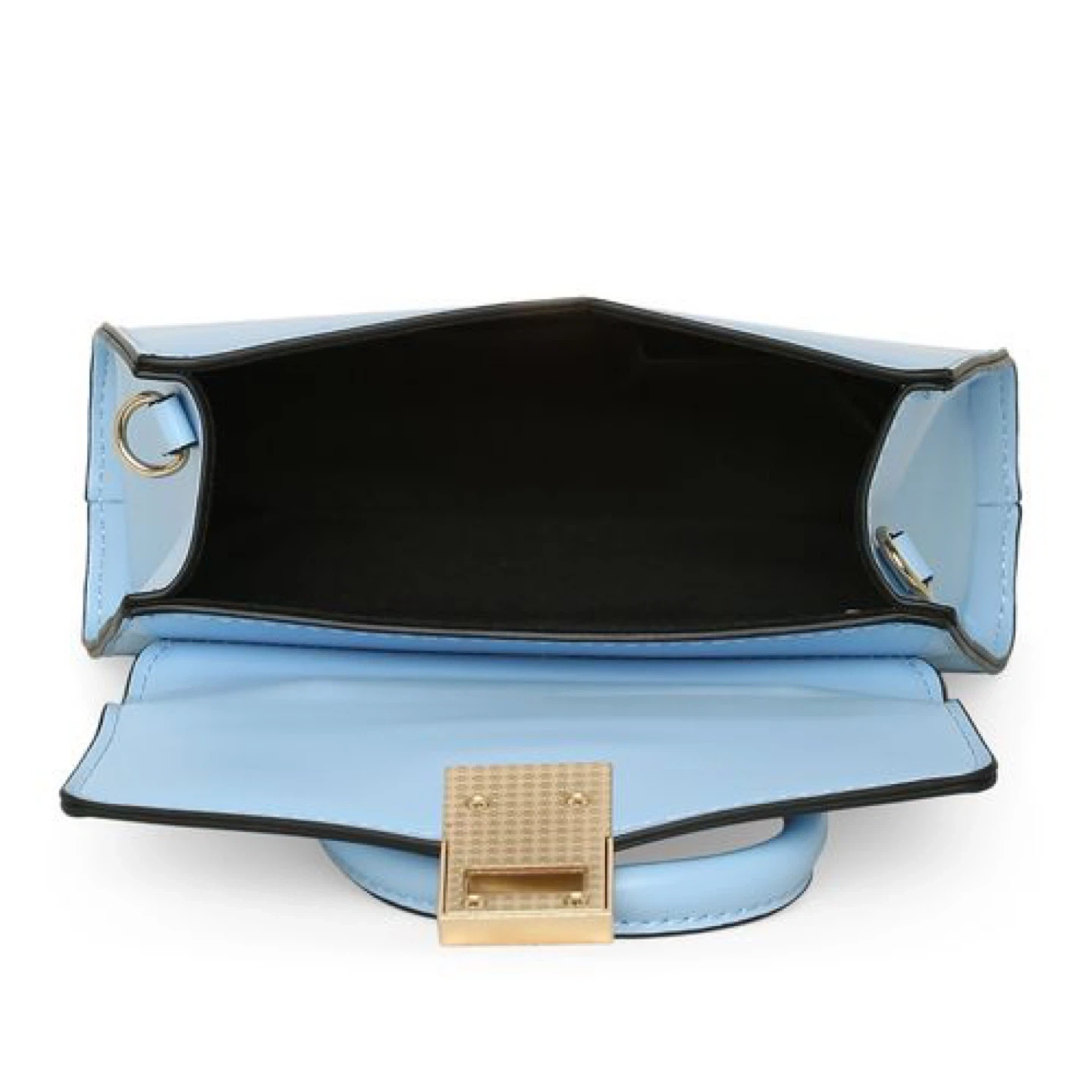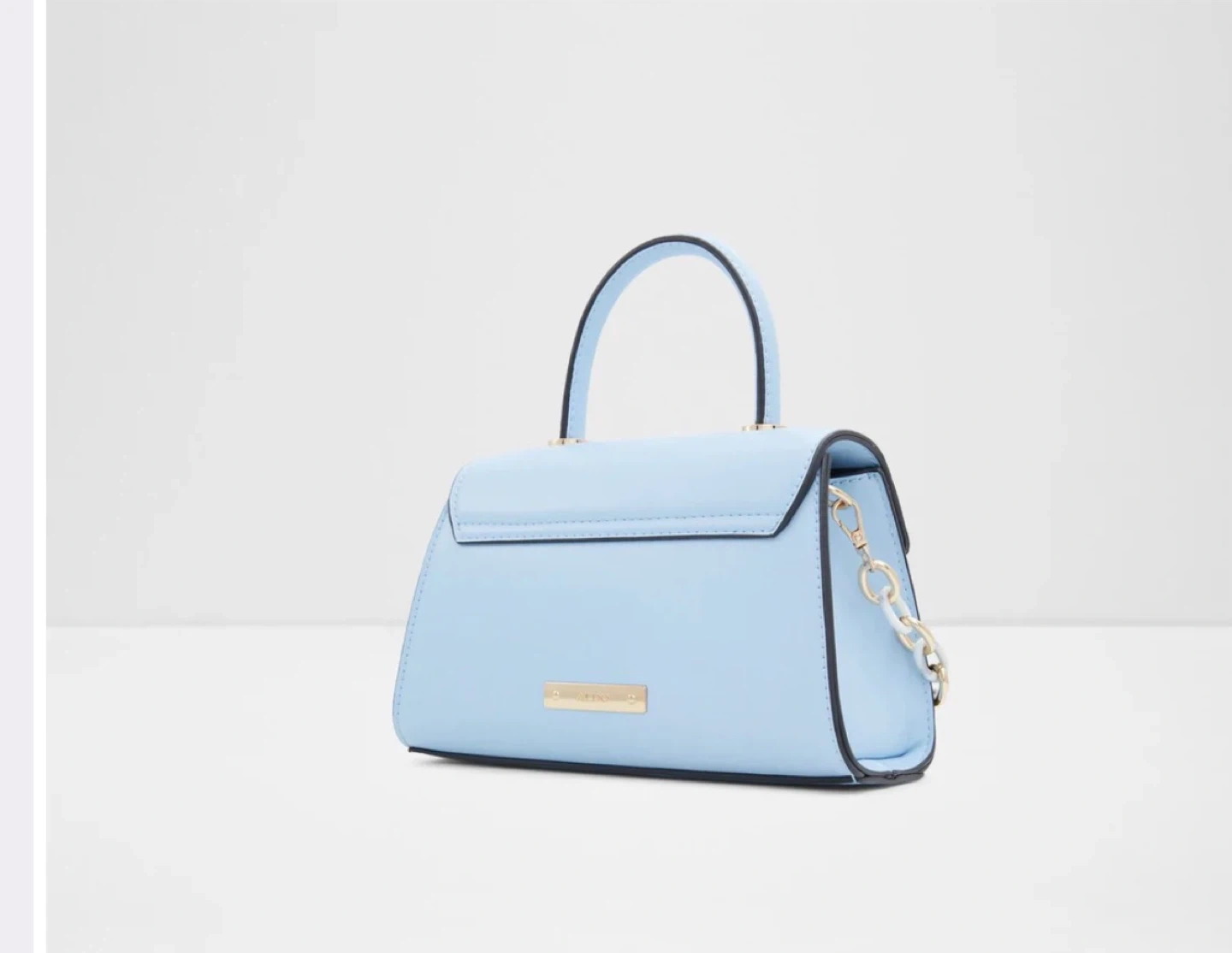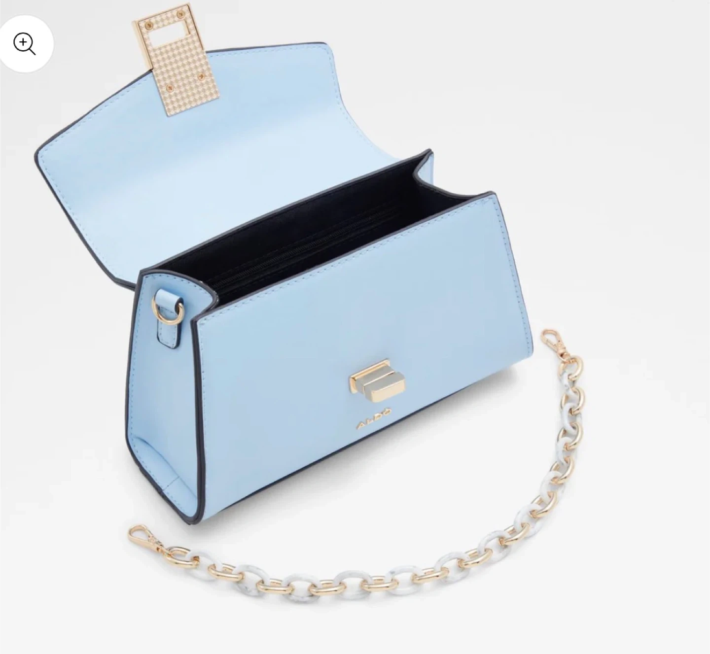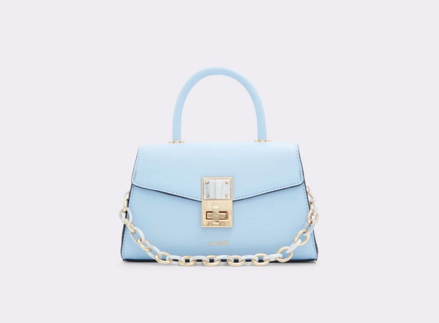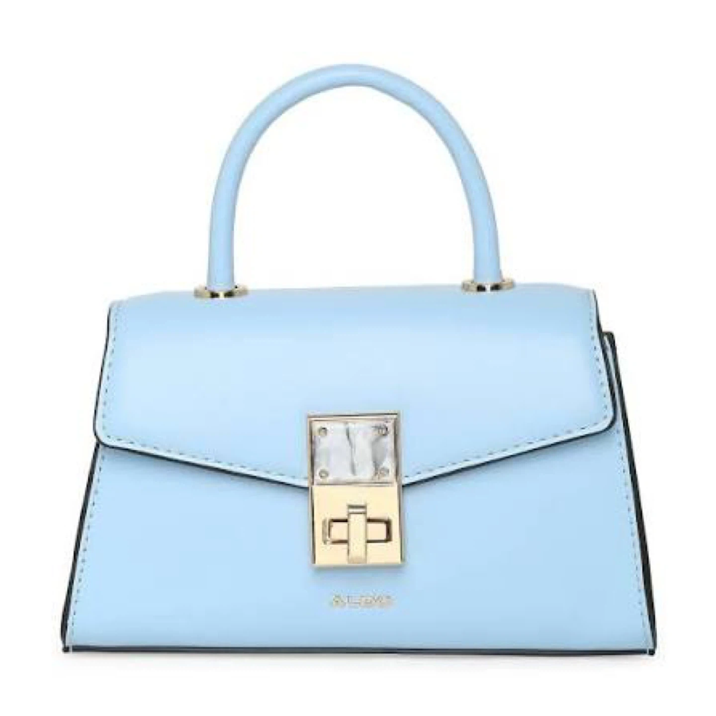 This is a stylish light blue top handle purse from ALDO. It comes with a decorative gold chain strap and a detachable crossbody strap. The purse features a secure clasp closure and a chic, compact design.