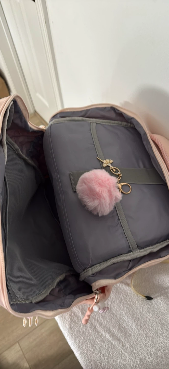 This pink backpack has a spacious main compartment and several exterior pockets for organization. It features padded shoulder straps and a top handle for comfortable carrying. A cute pink pom-pom charm is attached to one of the zippers.