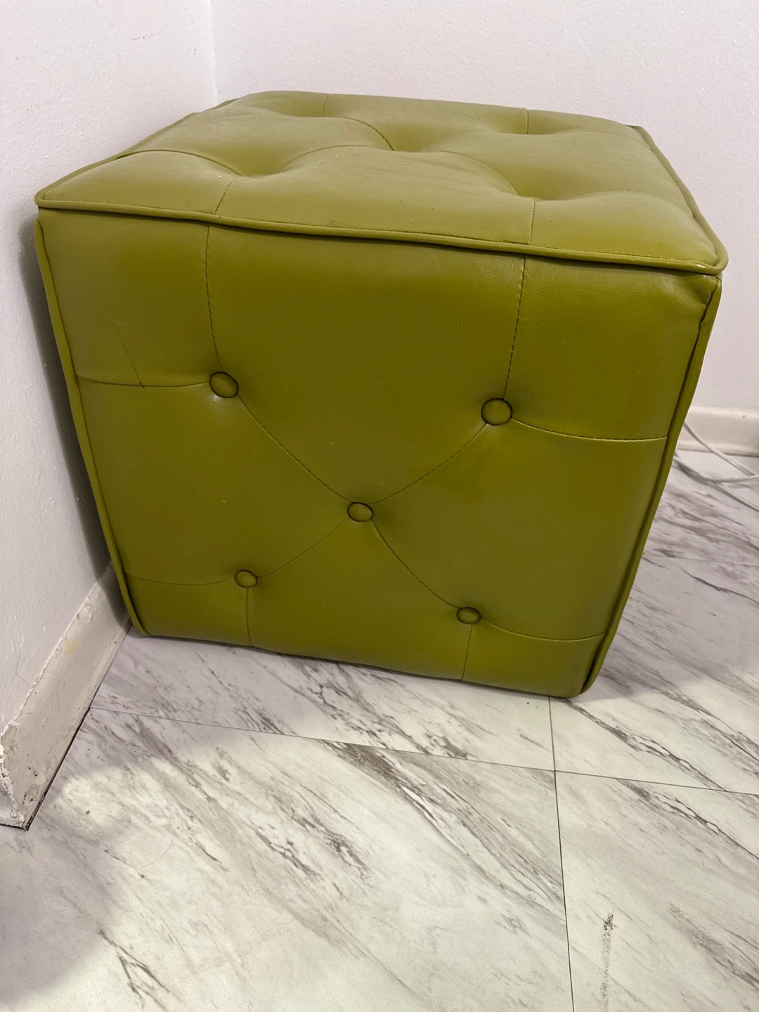 A lime green tufted ottoman. Upholstered in a faux leather material. It's a cube shape with button accents on all sides. Perfect for extra seating or as a footrest!