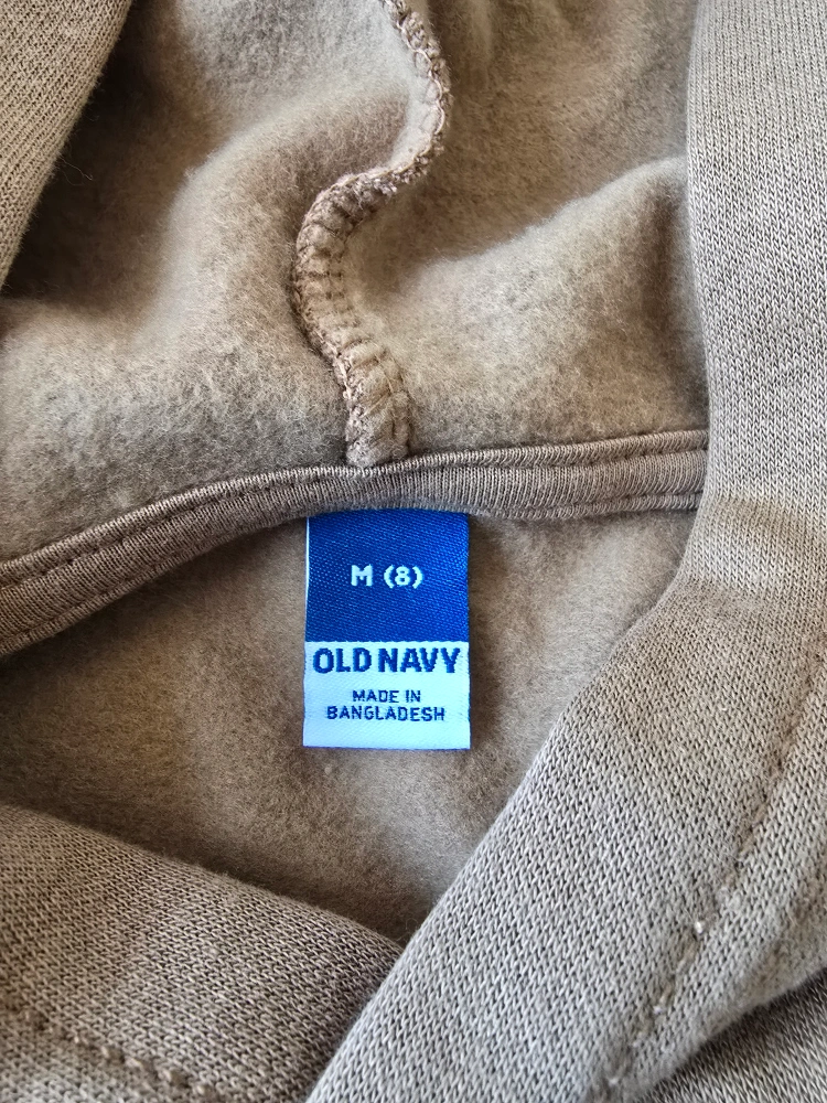 A cozy Old Navy hoodie for kids in size M (8)! It's a nice neutral colour. Perfect for layering or wearing on its own. Great for keeping warm on cooler days!