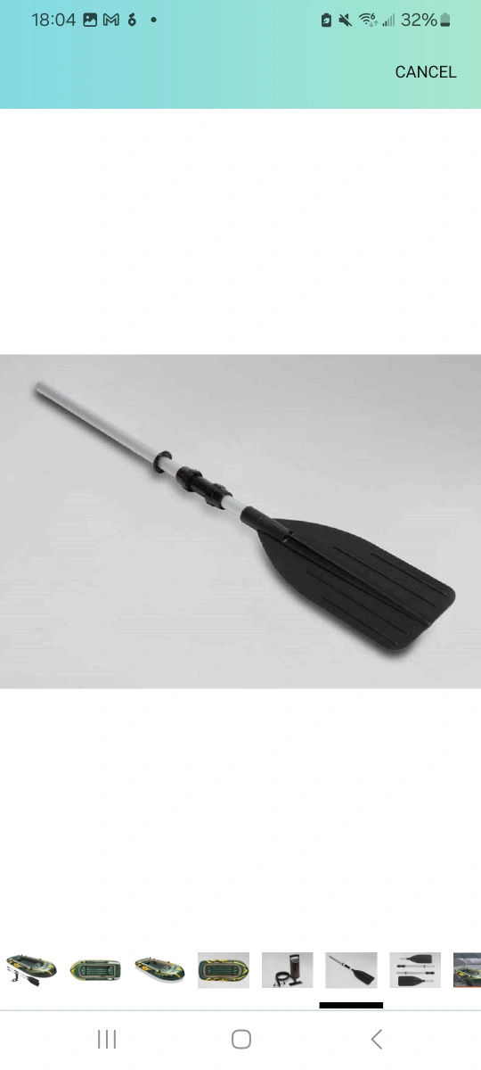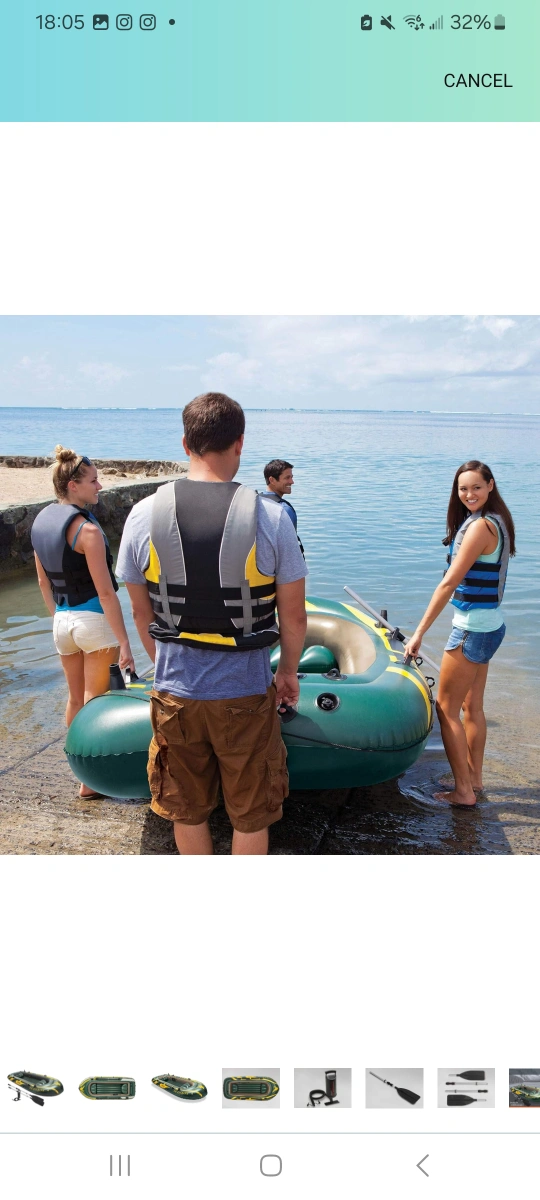 Four-person inflatable boat with two oars. Includes a hand pump.