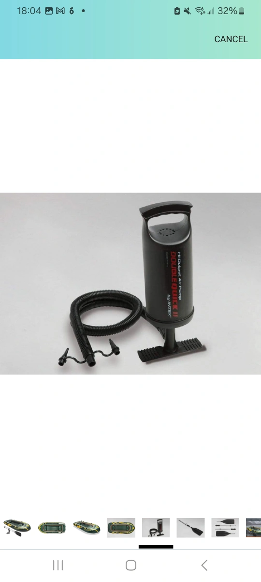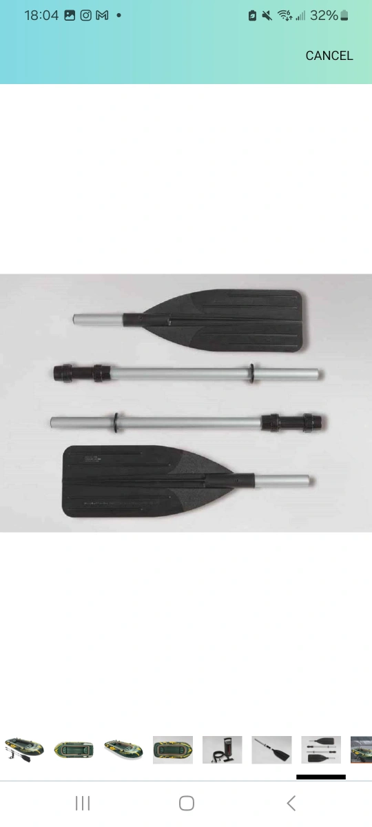 Four-person inflatable boat with two oars. Includes a hand pump.
