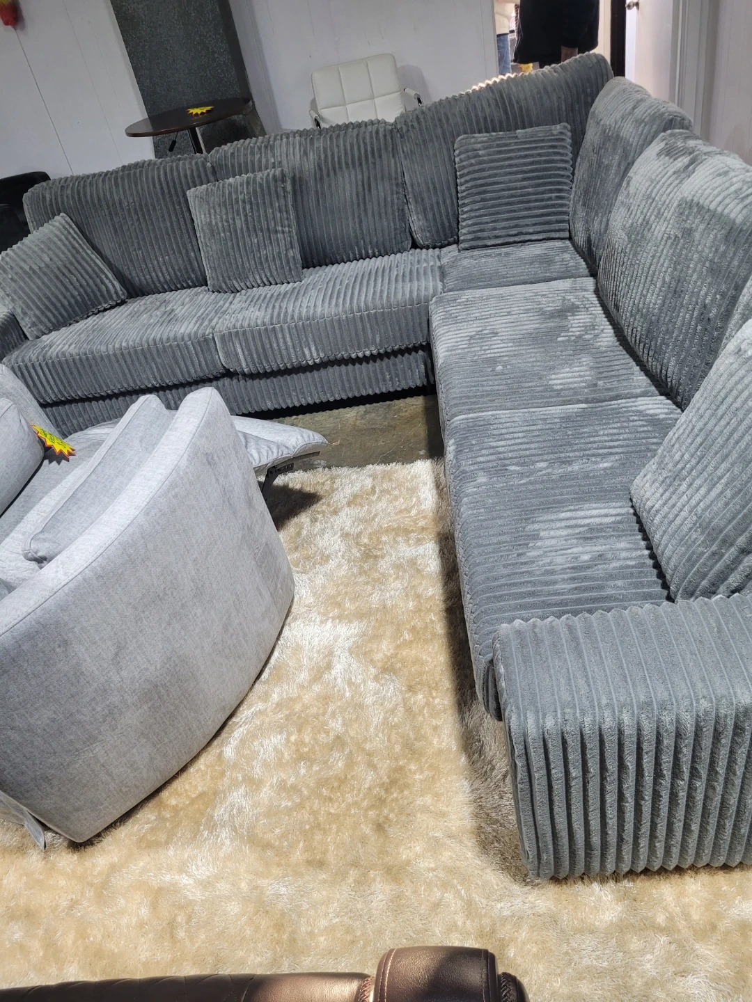 Spacious grey corduroy sectional sofa. It features a textured ribbed fabric and comes with multiple plush throw pillows. Includes a matching accent chair with a swivel base. Perfect for a large living room!