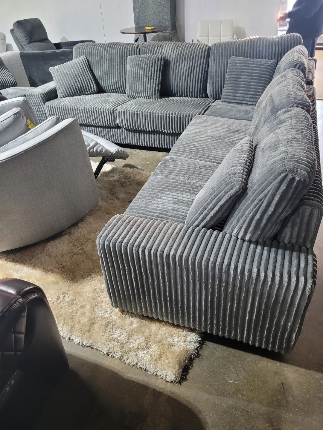 Spacious grey corduroy sectional sofa. It features a textured ribbed fabric and comes with multiple plush throw pillows. Includes a matching accent chair with a swivel base. Perfect for a large living room!