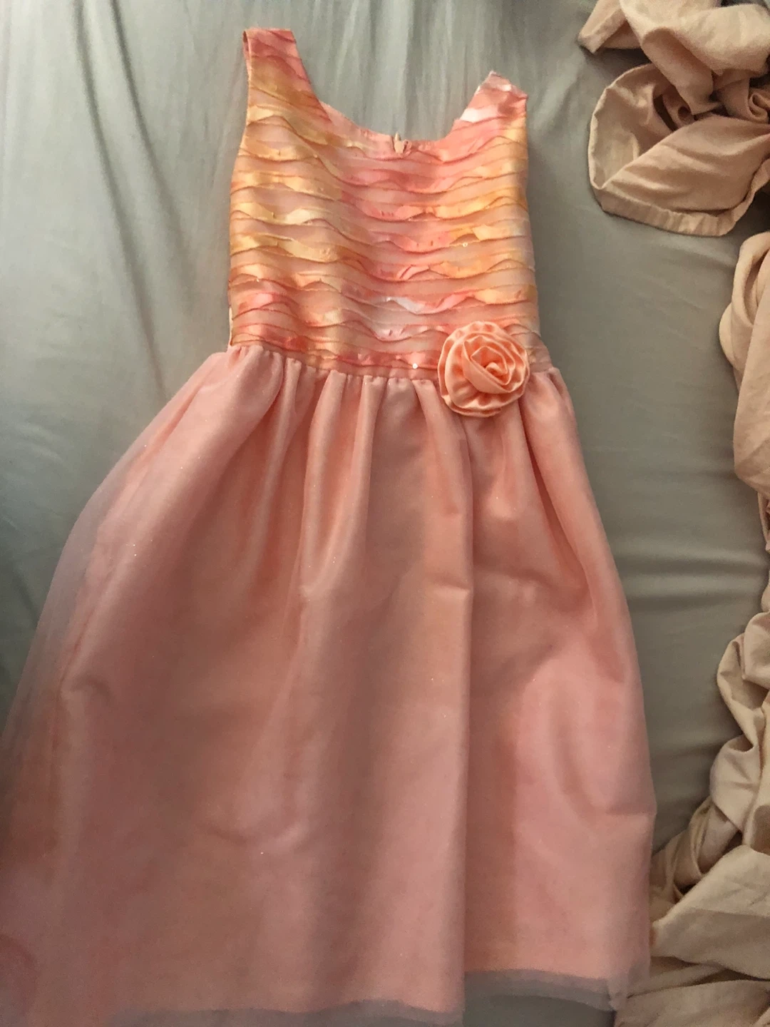 This pretty dress features a pink and orange wavy ribbon accent on the bodice with a delicate rose applique on the side. The skirt is a shimmering tulle, perfect for special occasions. It has a zipper closure on the back.