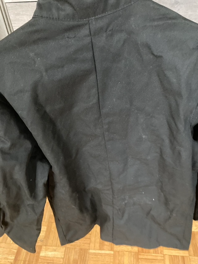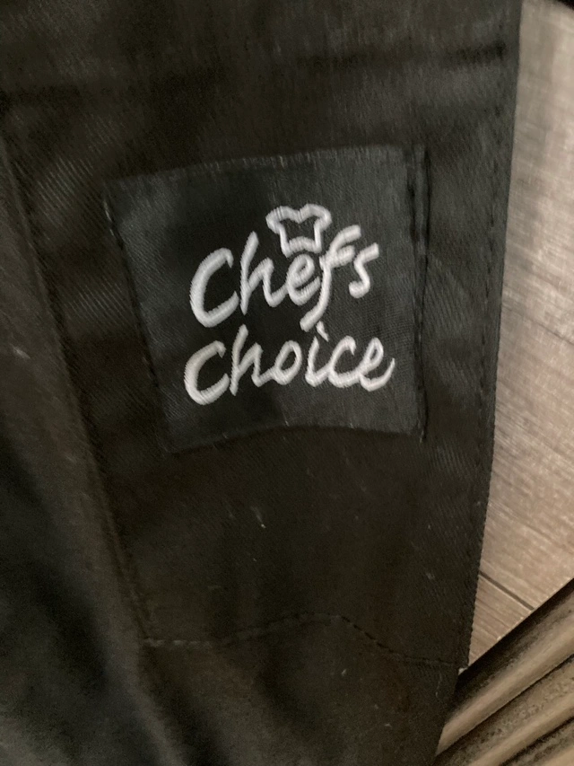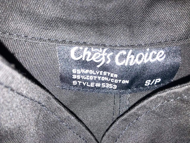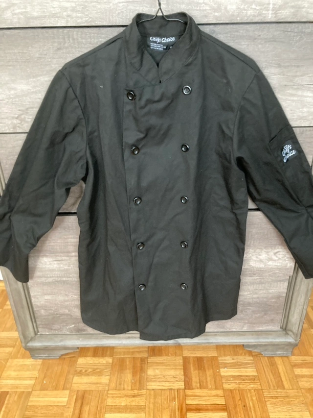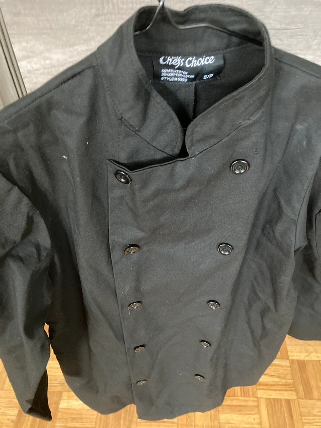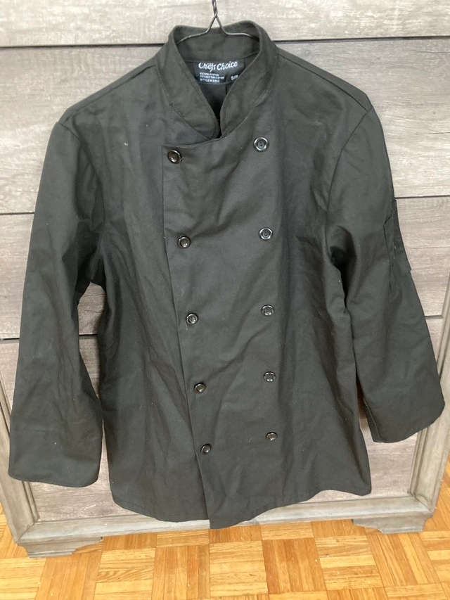 Black Chef's Choice Chef Jacket, size Small/Medium. Features a double-breasted closure, a stand-up collar, and a patch on the left sleeve. Made of 65% polyester, 35% cotton.