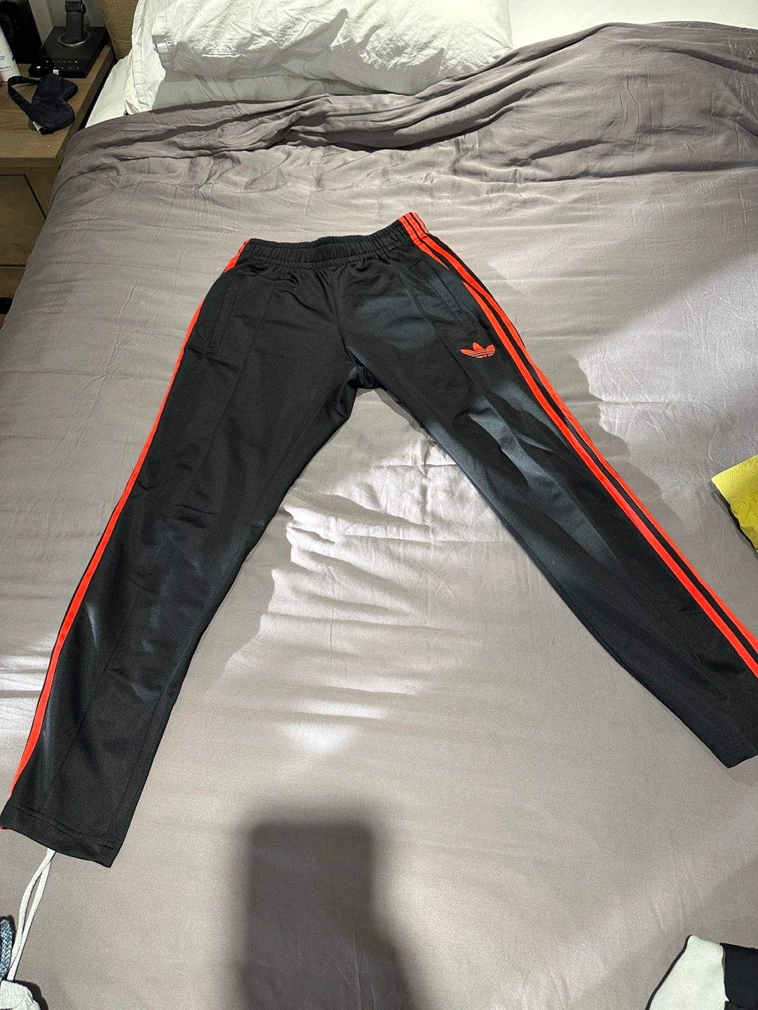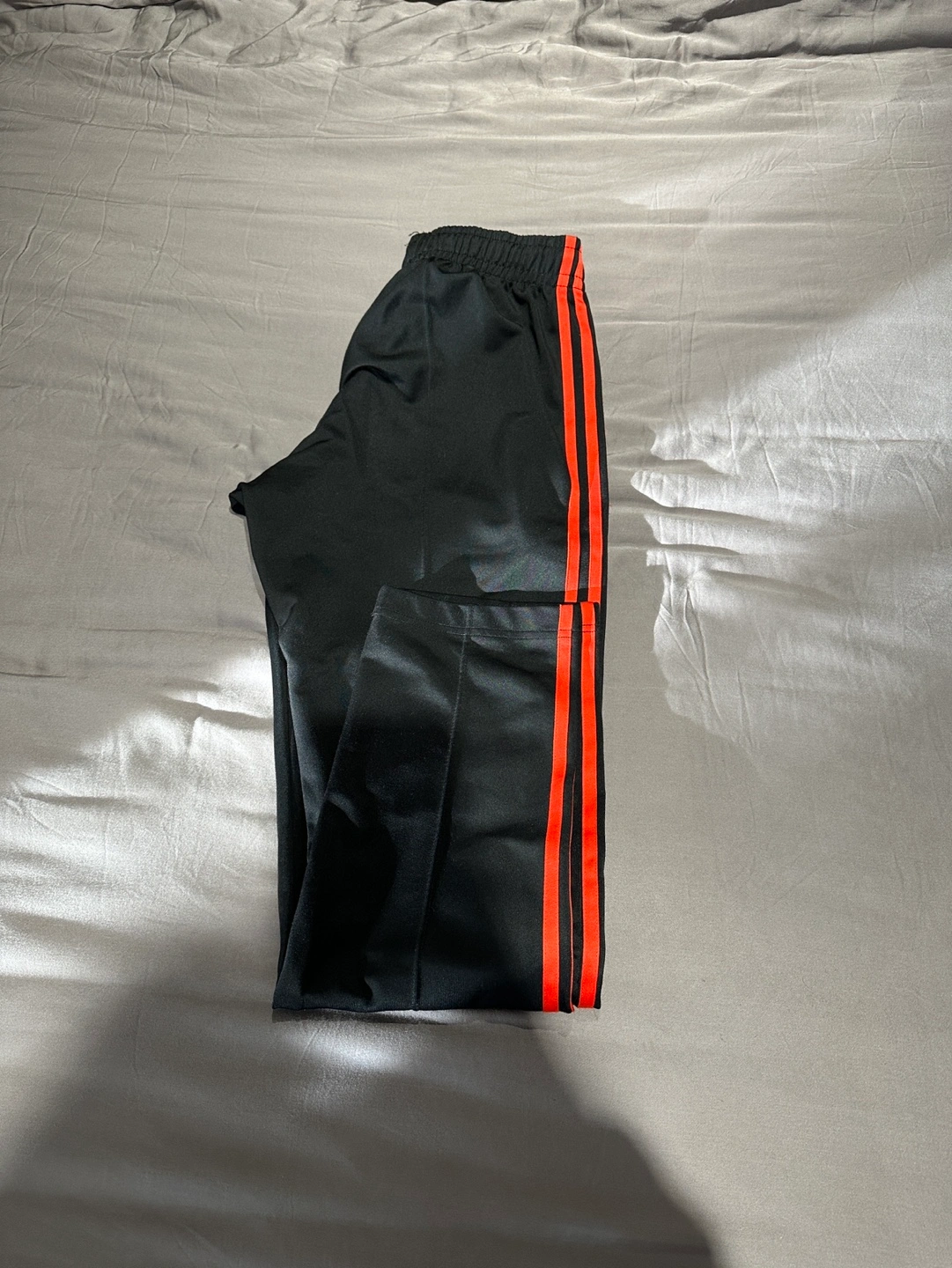 Black Adidas track pants red stripes down the sides. Elastic waistband. Great for workouts or casual wear.