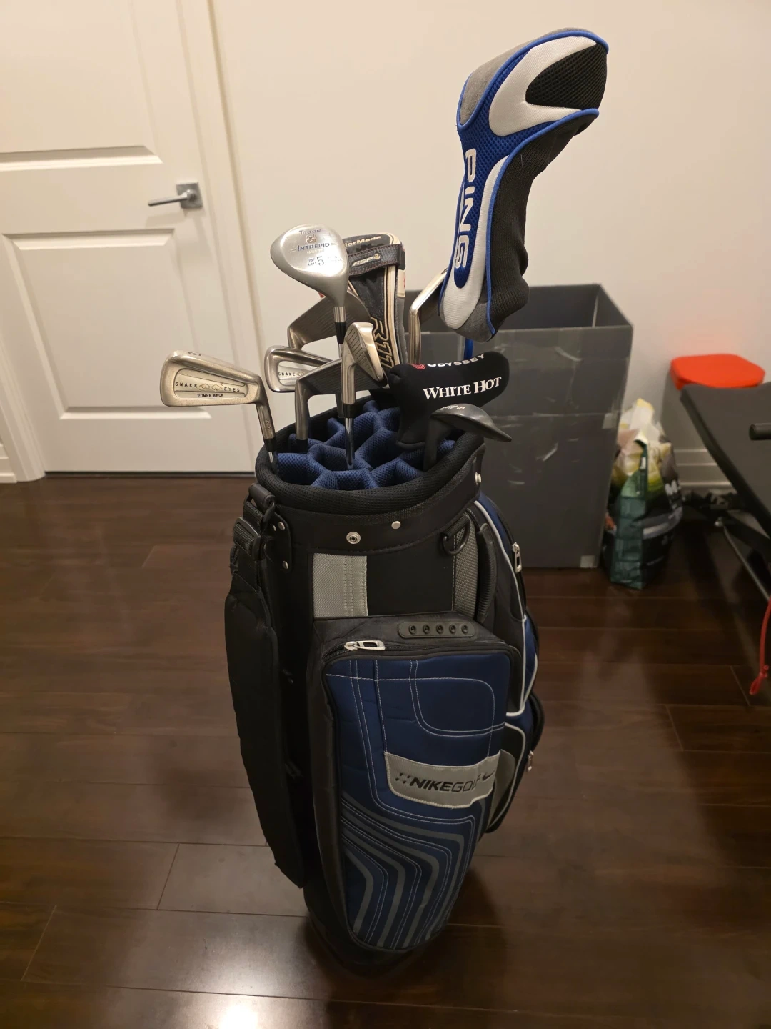 This is a full set of golf clubs for man including a PING driver, woods, Troon woods, Cleveland wedges, and Odyssey putter. It also comes with a Nike golf bag. Clubs are labelled with brand names like PING, troon, Cleveland, and Odyssey. With used balls. Pins. Glove. It is good.choice for beginners.