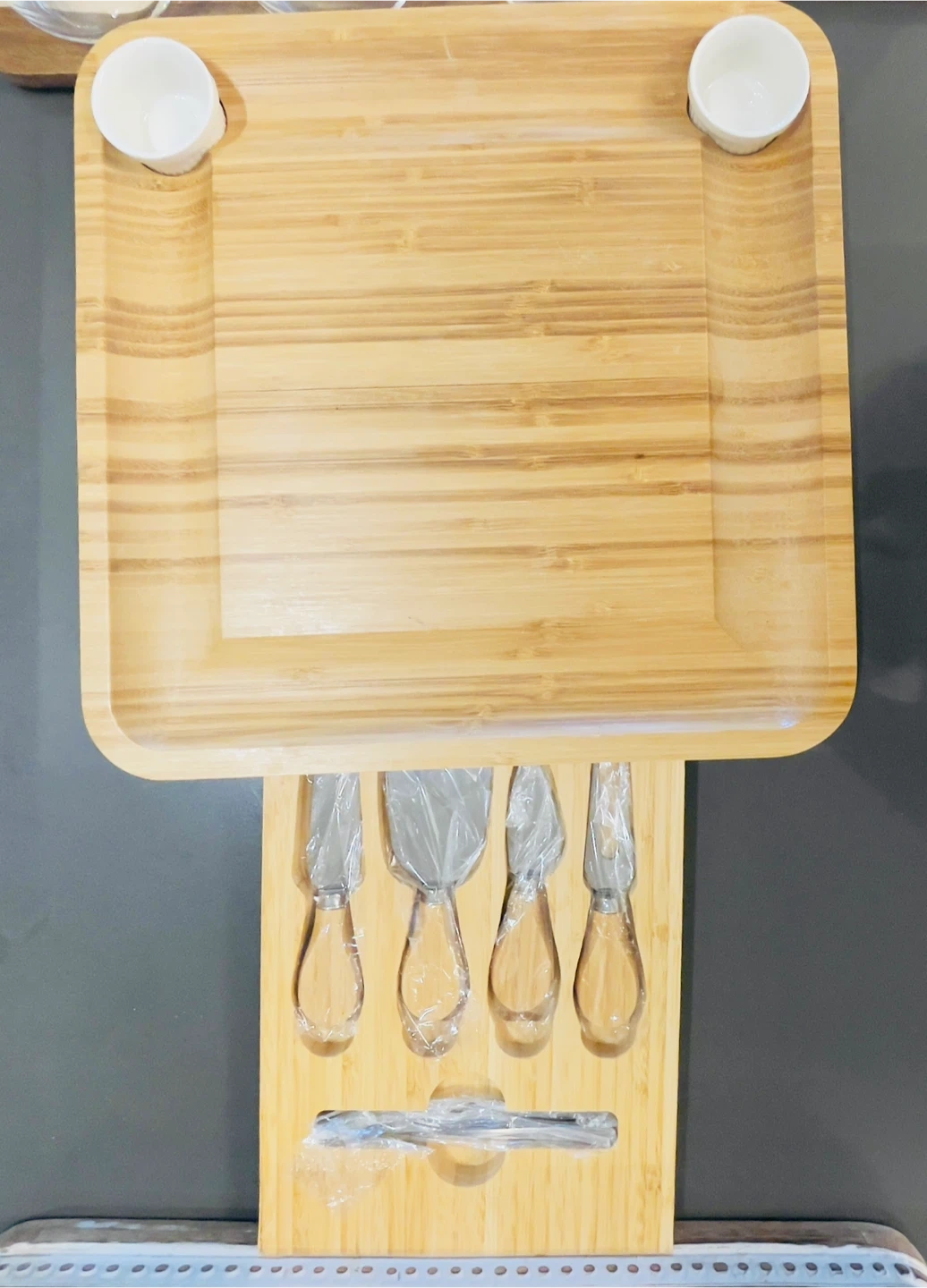 • 1 Charcuterie Board – Comes with two small dip bowls, cheese knives (still in original packaging), and stainless steel picks