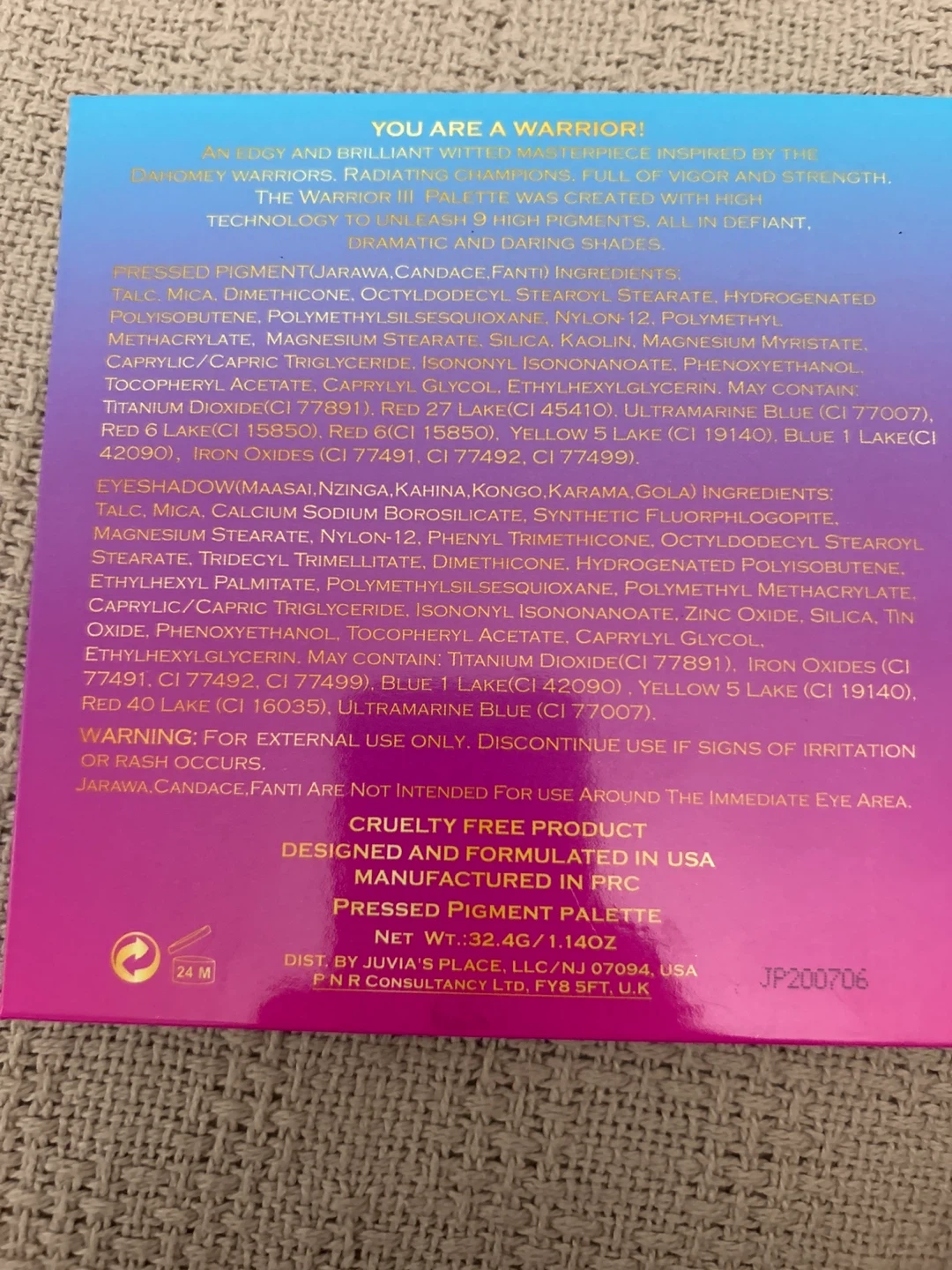This Juvia's Place eyeshadow palette features 9 highly pigmented shades. It's cruelty-free and manufactured in PRC. Net weight is 32.4g/1.14oz.