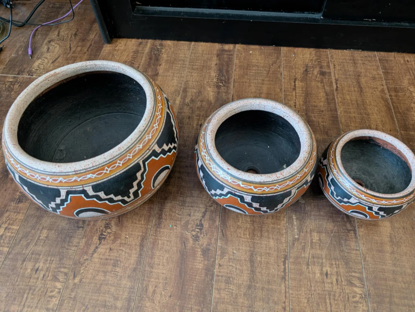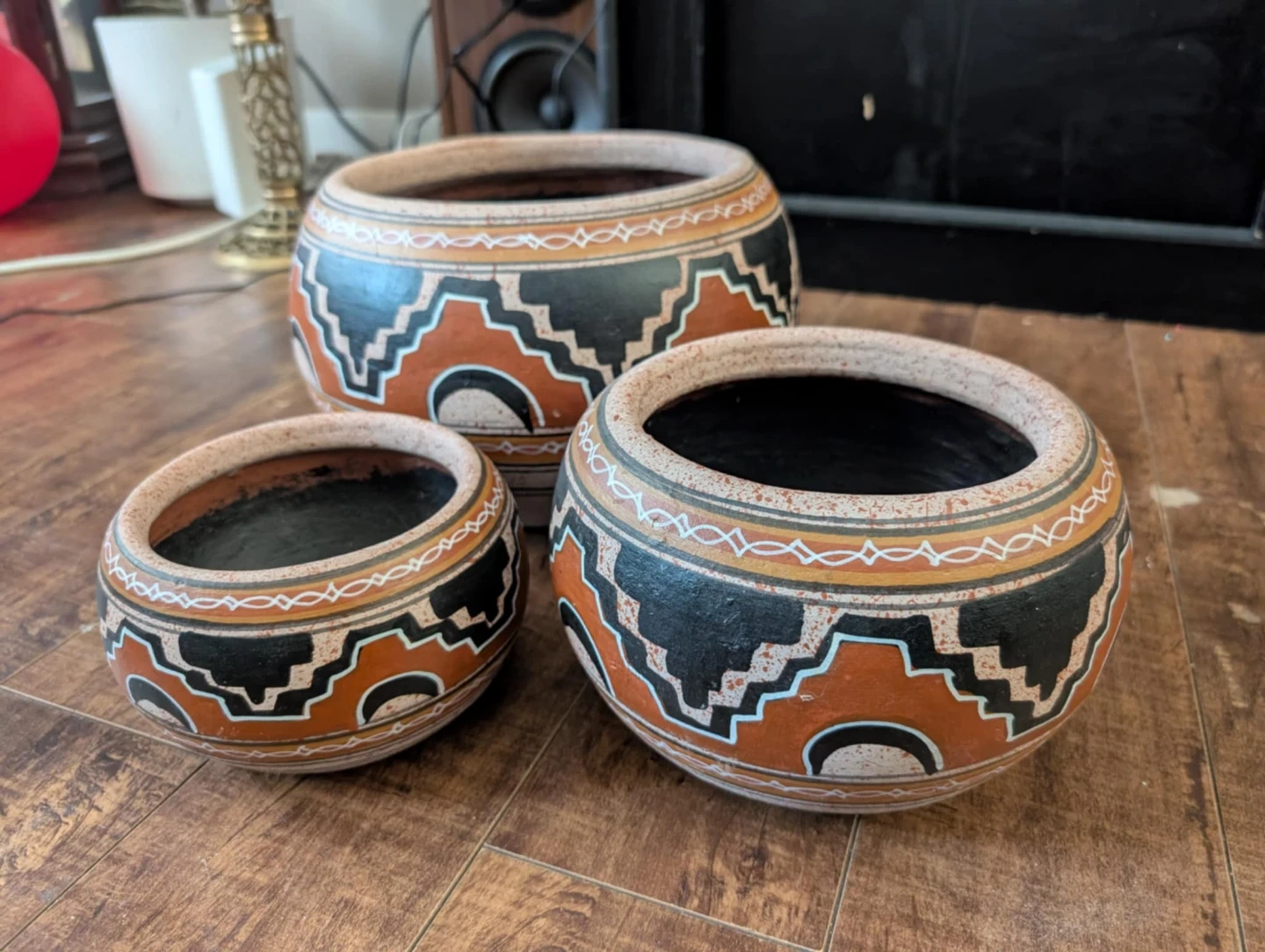 Mexican original.decorative ceramic pots with a unique tribal pattern. They're made of clay and come in three different sizes. Use them for small plants or as stylish decor!