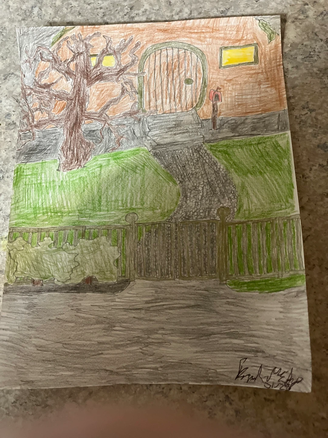 This is an original drawing depicting a charming scene of a hobbit hole. It shows the round wooden door, a winding path, and a large, bare tree. The artwork also includes a small mailbox and a gold fence with greenery. A unique piece for any fan of halflings or hobbits. Dimensions are 8.5”x11”, you can get the print on either cardboard print or print paper you choose. Shipping is $6.00 Canadian