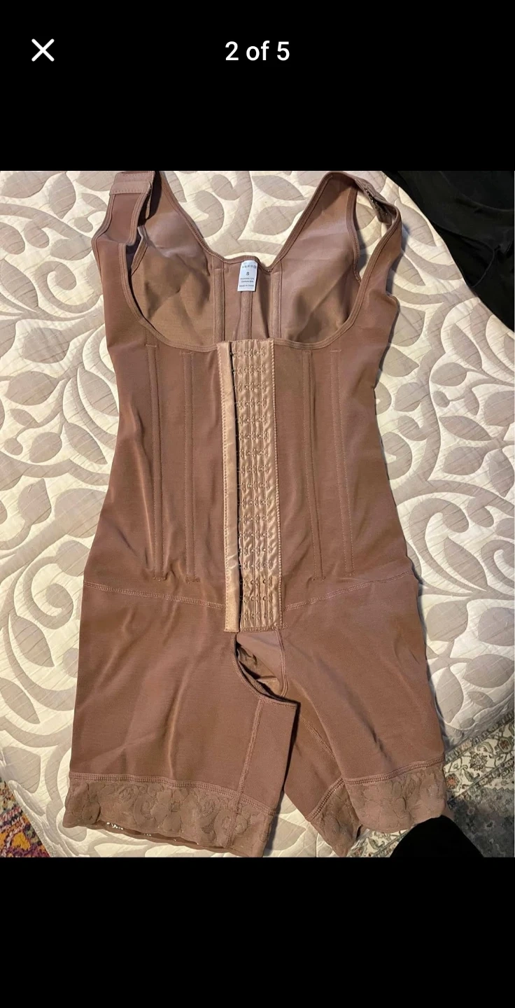 This women's bodysuit shapewear is designed for a smooth silhouette. It features adjustable straps and a hook-and-eye closure for a secure fit. The open-bust design allows for flexibility with your own bra choice. The lace trim adds a delicate touch.