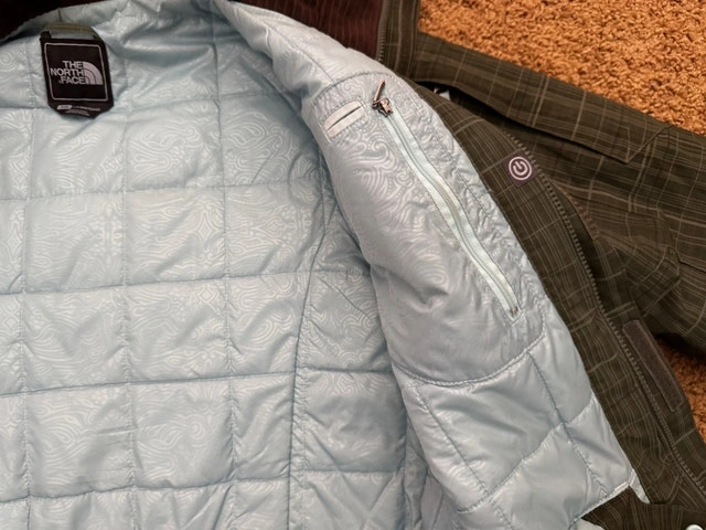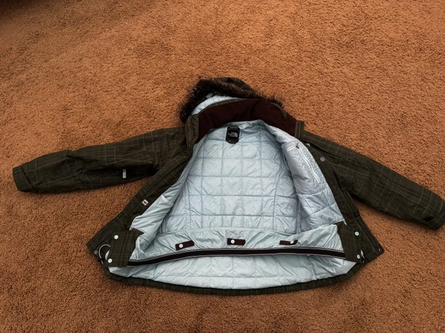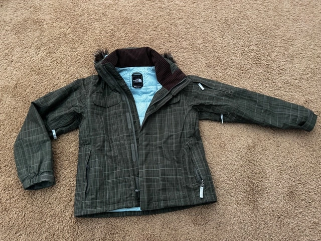 Dark green insulated jacket, ideal for winter and spring skiing. Features 2 front zipped pockets, 2 breast pockets, an arm ski pass pocket, and pit zips. Inside, you'll find a zipped pocket, goggle pouch, and powder skirt. Detachable fur-trimmed hood. This jacket would also fit a youth or teenager. Asking $40