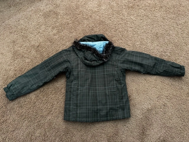 Dark green insulated jacket, ideal for winter and spring skiing. Features 2 front zipped pockets, 2 breast pockets, an arm ski pass pocket, and pit zips. Inside, you'll find a zipped pocket, goggle pouch, and powder skirt. Detachable fur-trimmed hood. This jacket would also fit a youth or teenager. Asking $40