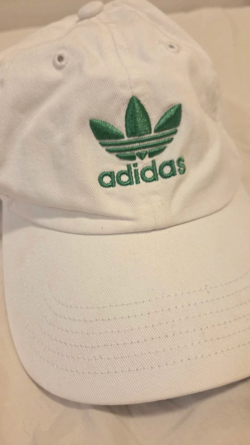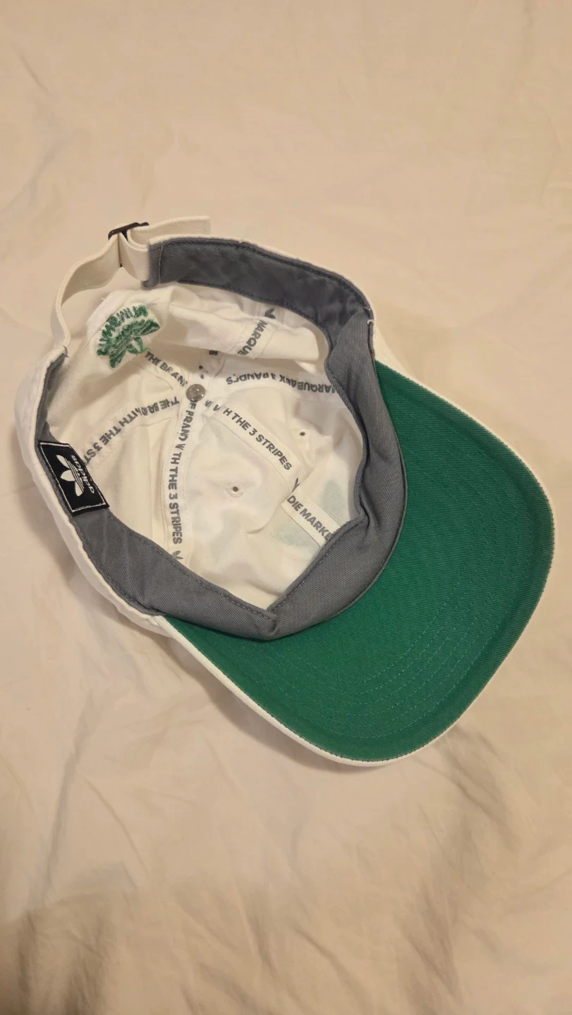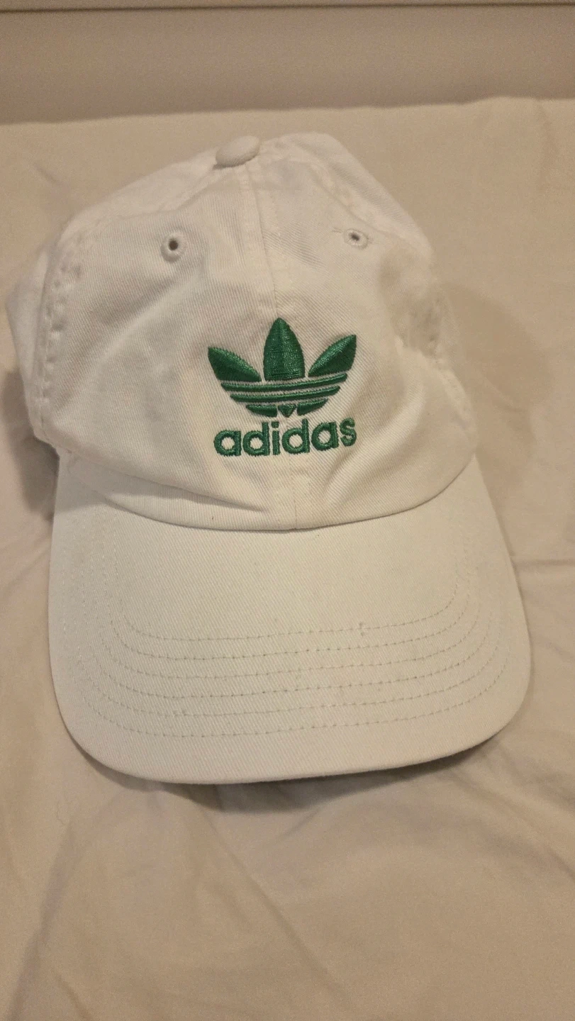 White Adidas cap hat with green Stan Smith branding and adjustable strap. Size is One Size Fits All.