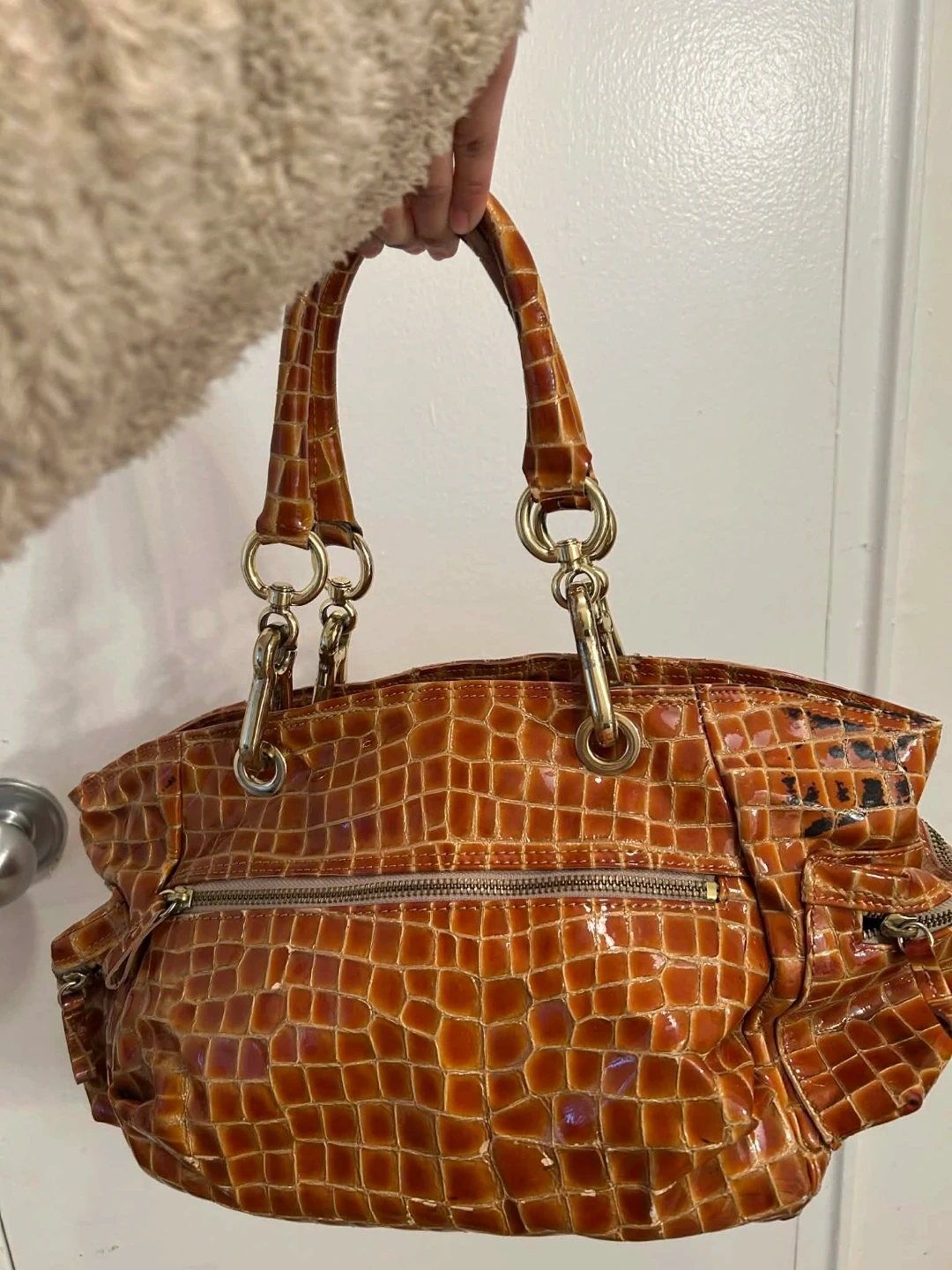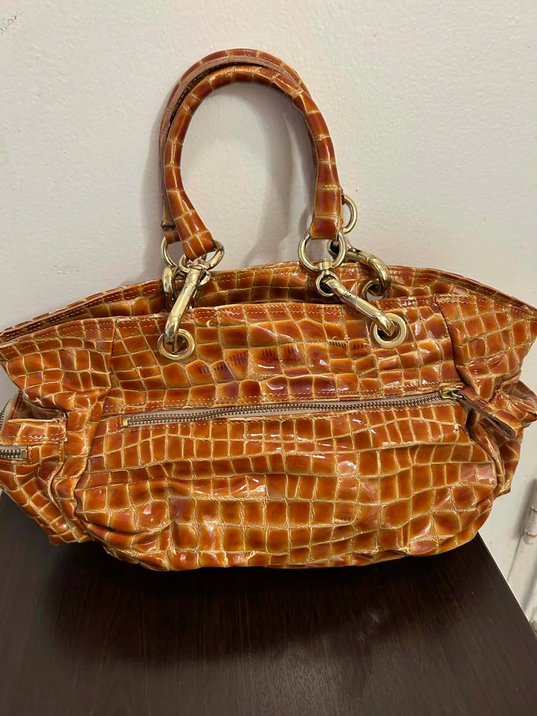 Stylish brown handbag with a faux crocodile texture. It features a zippered main compartment and gold-tone hardware. This versatile bag is perfect for everyday use or a night out!