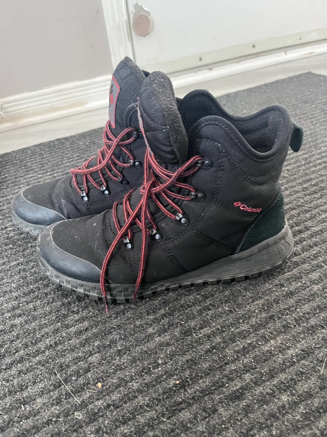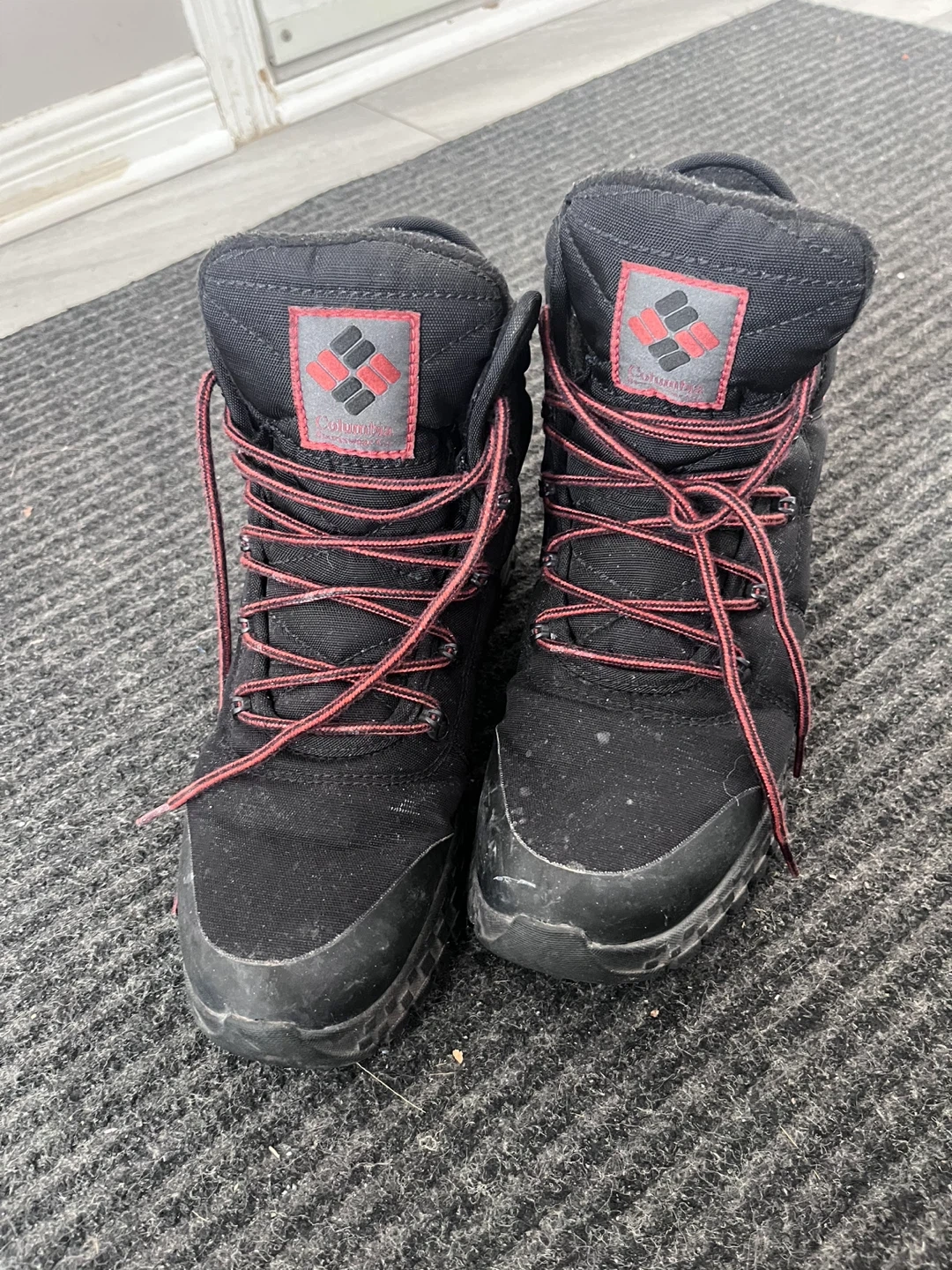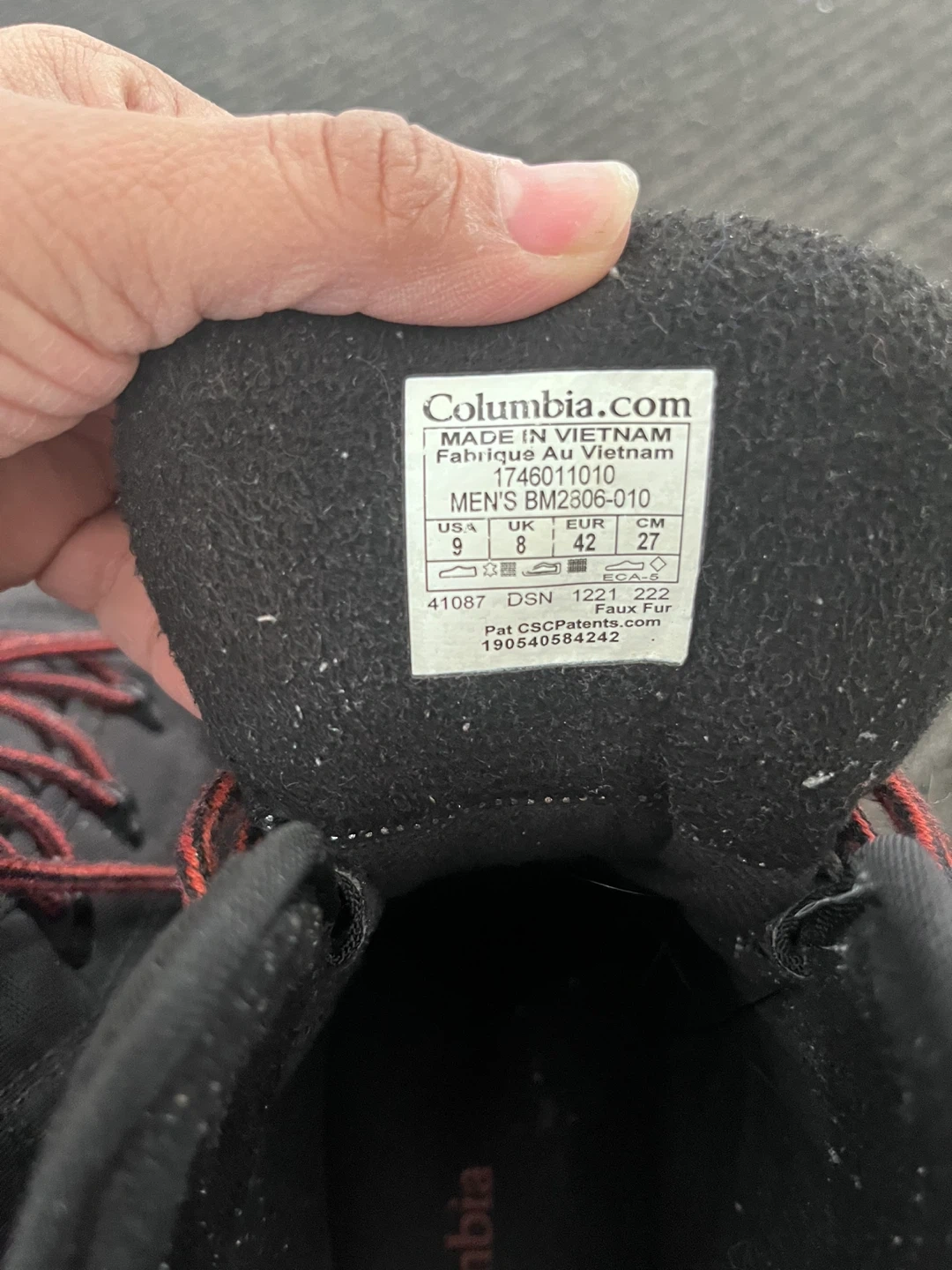 Columbia black snow boots for men. Size 9 US, 8 UK, 42 EUR, 27 CM. These boots are designed for cold weather and offer good traction.
