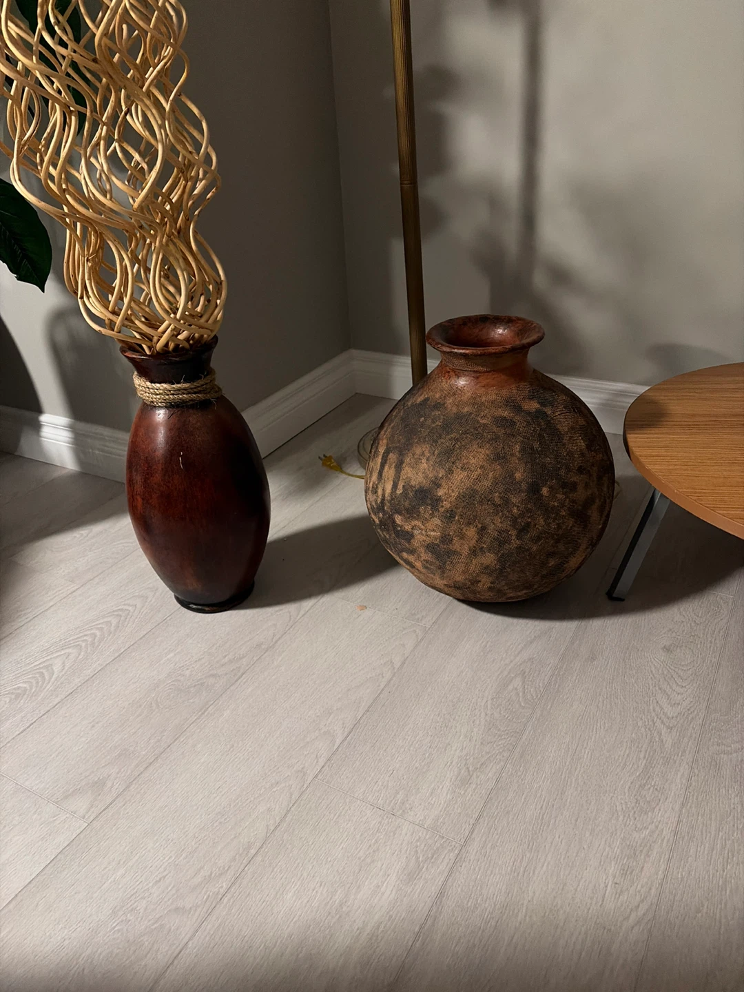 Tall, dark brown wooden vase with natural twine accent. It's topped with a large arrangement of twisted, light-coloured natural reeds. Round, textured terracotta-style vase with a distressed finish is also available. Selling both for one price