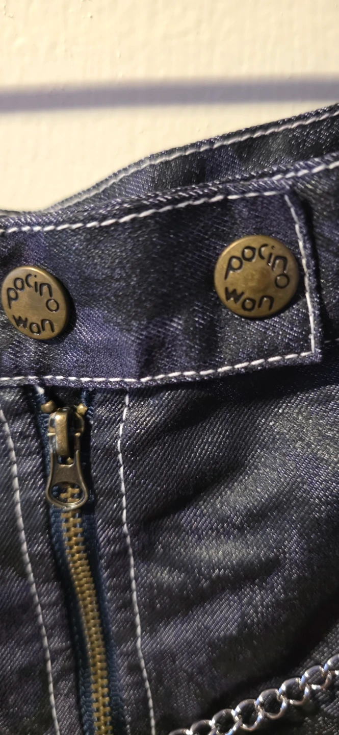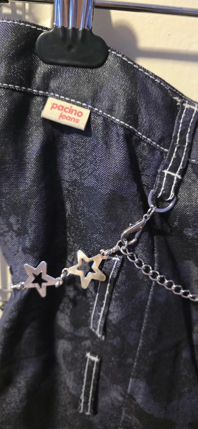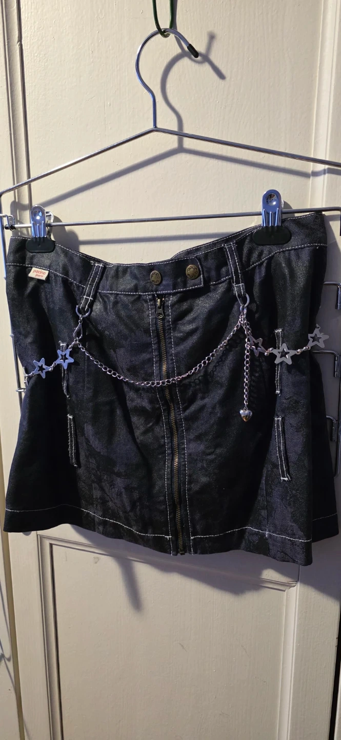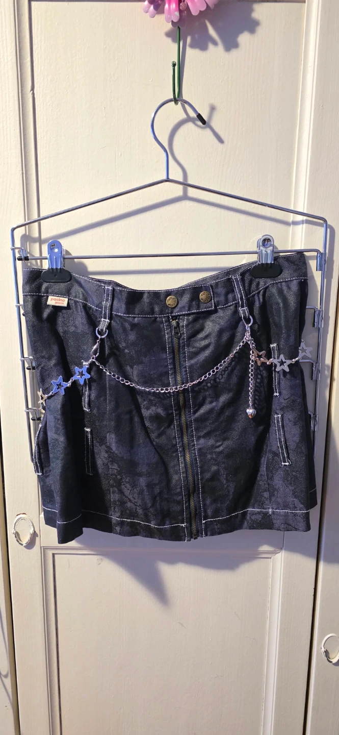 Selling a Pacino Jeans denim skirt in size small! It's a dark wash denim with a zipper and button closure. It also has a cute chain detail with stars and a heart. Perfect for adding a bit of an edge to your outfit!