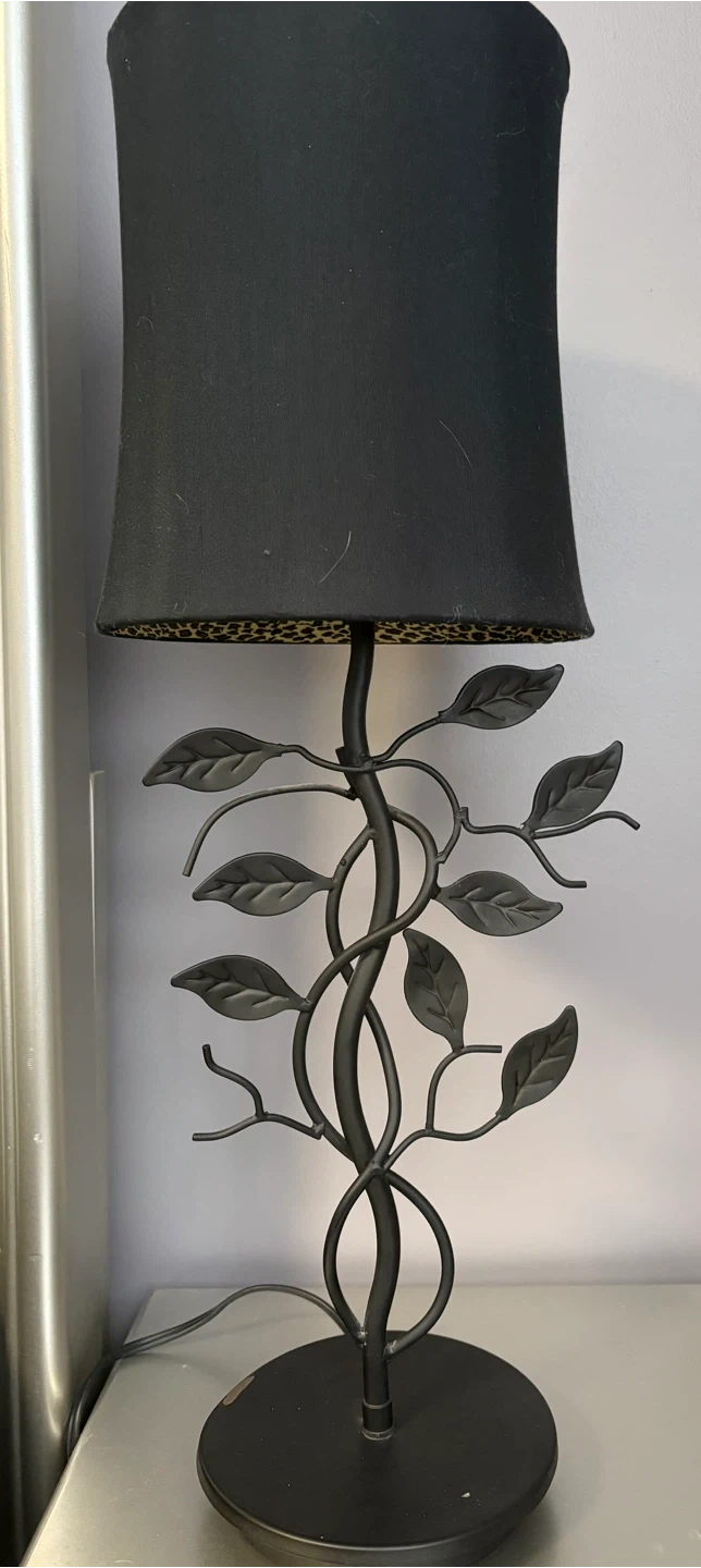 Selling a lovely black metal table lamp with a leaf design. It has a black lampshade with a fun leopard print interior! It would look great in any room