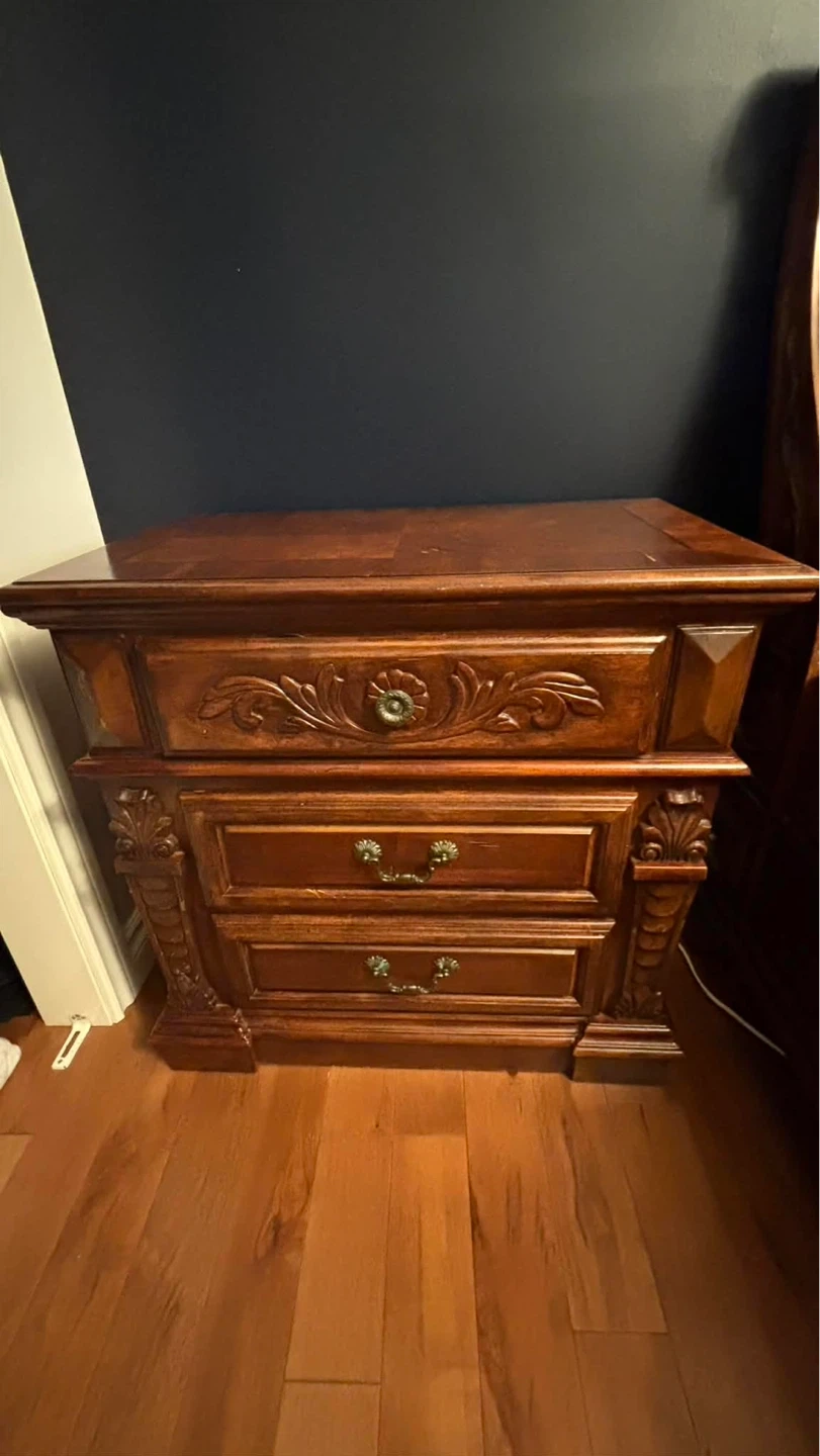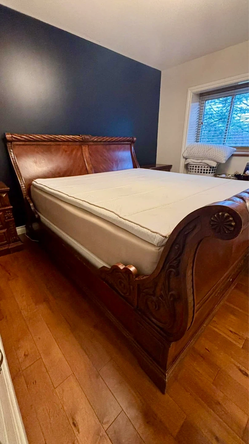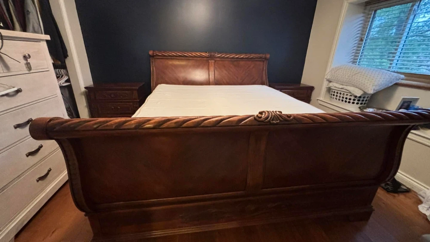 Beautifully carved wooden sleigh bed frame in a rich brown finish. Features ornate detailing on the headboard and footboard. Includes matching nightstands and a dresser. Solid wood construction.
