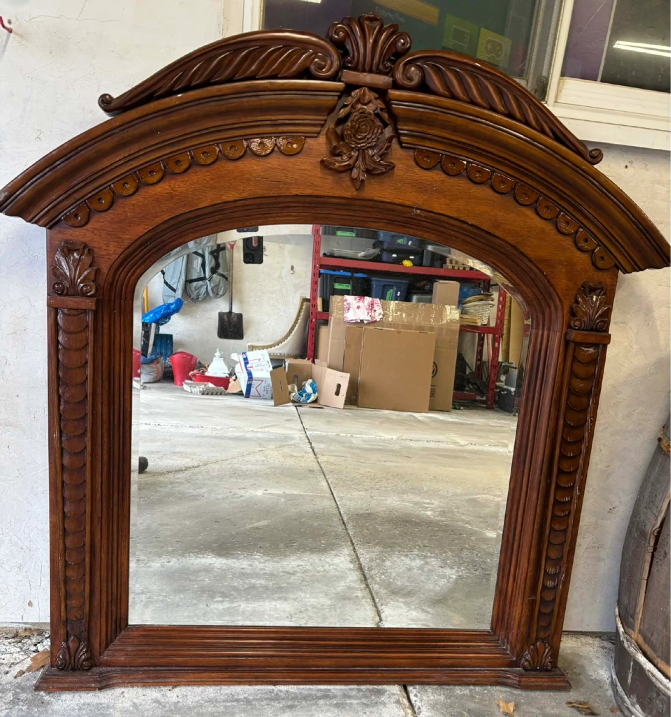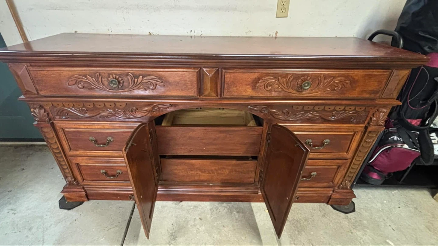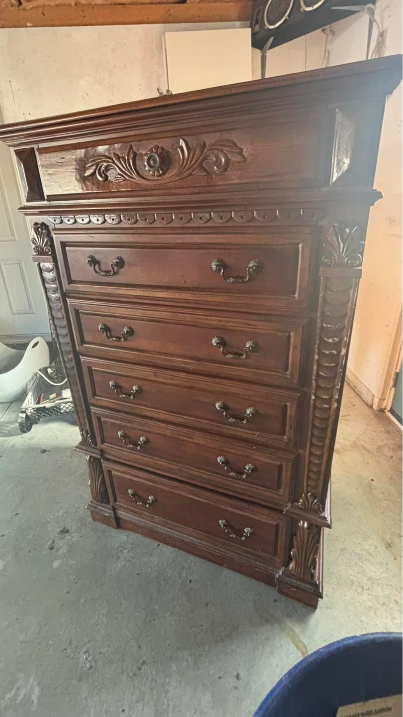Beautifully carved wooden sleigh bed frame in a rich brown finish. Features ornate detailing on the headboard and footboard. Includes matching nightstands and a dresser. Solid wood construction.