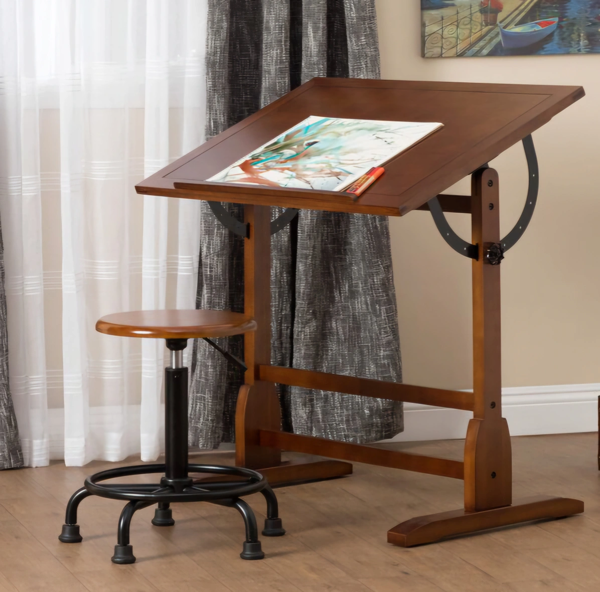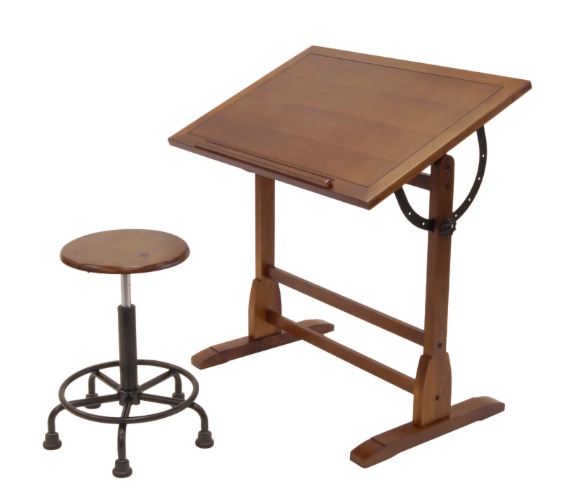 Adjustable Oak Drafting Table with Stool