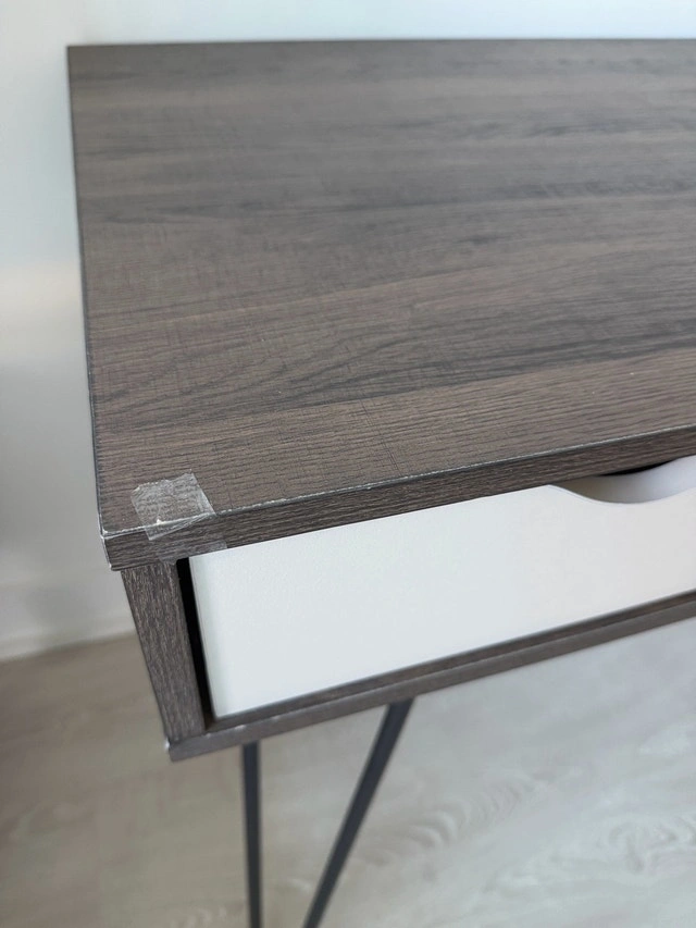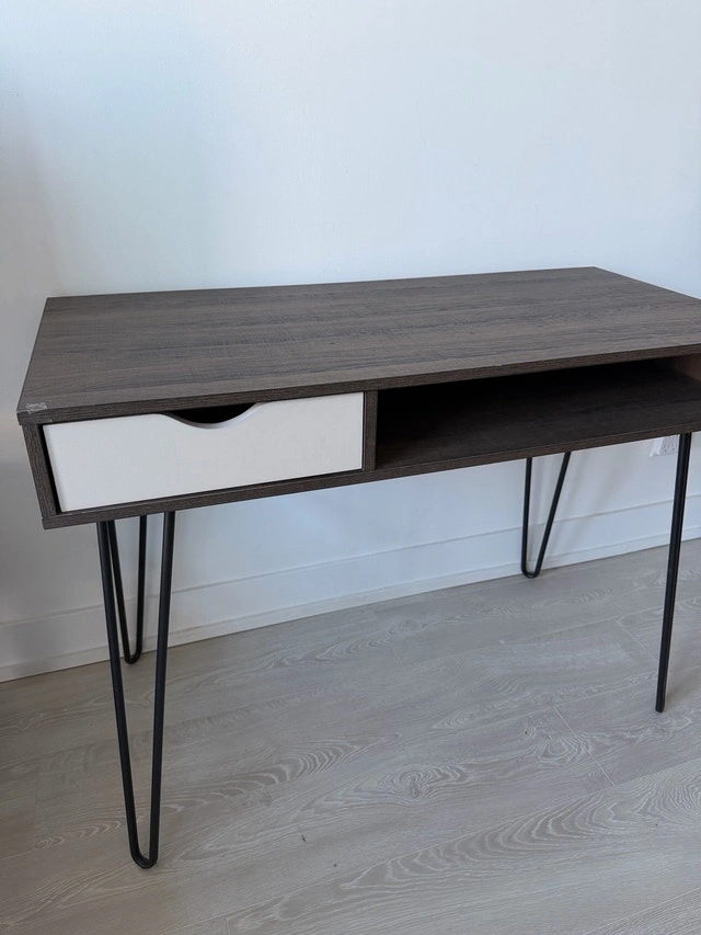 Stylish Concord computer desk, perfect for any home office. Features a brown oak and grey finish, a convenient drawer, and open storage. Hairpin legs add a modern touch. Selling because I'm redecorating. In good condition and ready for a new home! Brand: Concord. Colour: Brown oak and grey. Features: Drawer and open storage. Leg Style: Hairpin. Similar desks are often listed between $80 and $150, so this is priced to sell quickly! If you're seeing this ad, it's still available! Ready to give your workspace an upgrade?