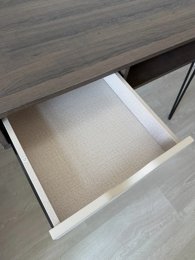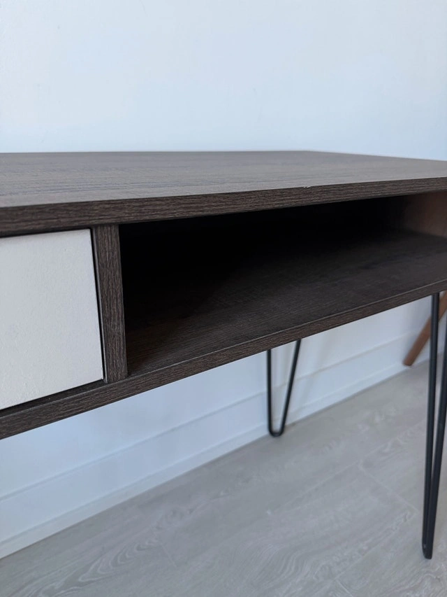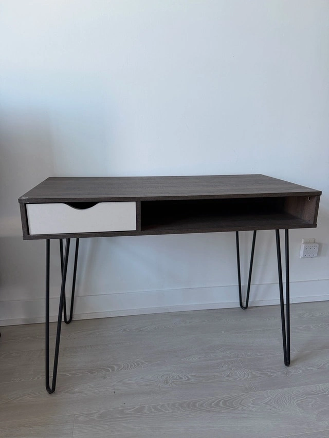 Stylish Concord computer desk, perfect for any home office. Features a brown oak and grey finish, a convenient drawer, and open storage. Hairpin legs add a modern touch. Selling because I'm redecorating. In good condition and ready for a new home! Brand: Concord. Colour: Brown oak and grey. Features: Drawer and open storage. Leg Style: Hairpin. Similar desks are often listed between $80 and $150, so this is priced to sell quickly! If you're seeing this ad, it's still available! Ready to give your workspace an upgrade?