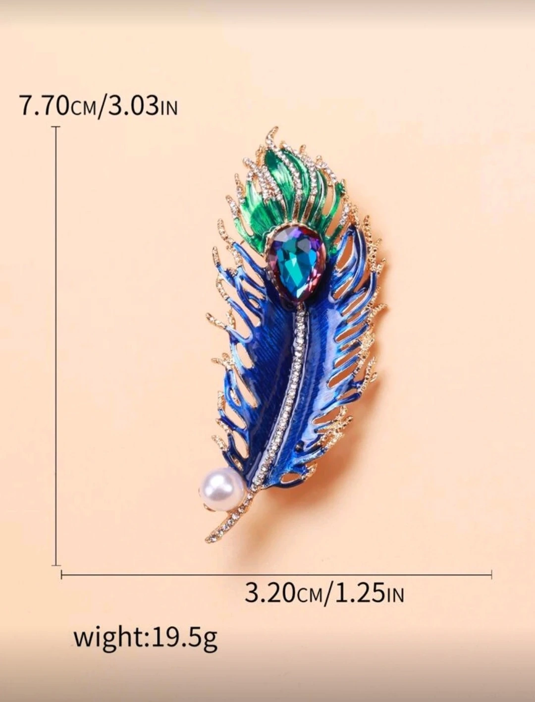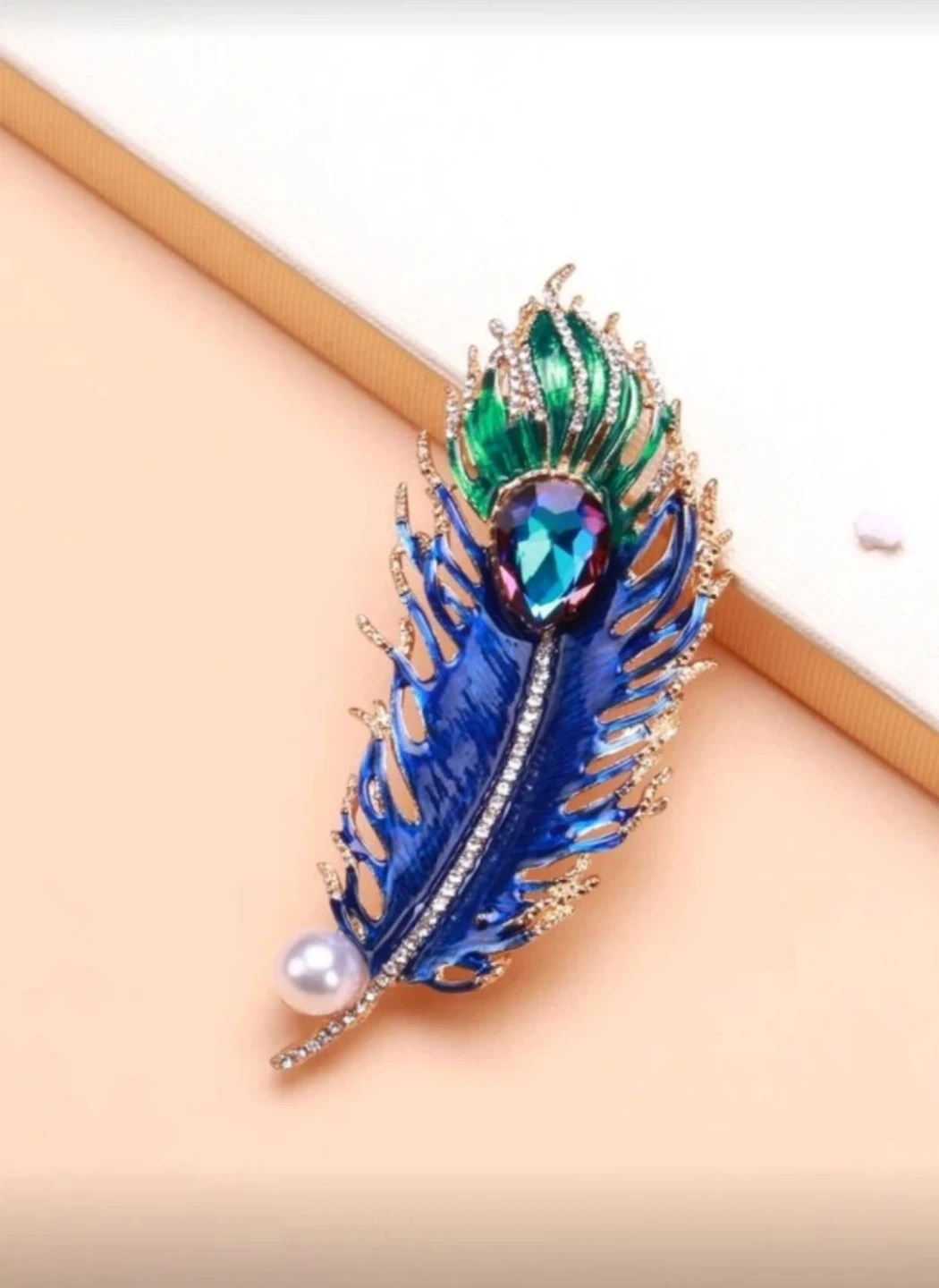 This beautiful brooch is designed to look like a peacock feather. It features colourful enamel, sparkling rhinestones, and a faux pearl accent. It's a lovely accessory to adorn clothing or a scarf!